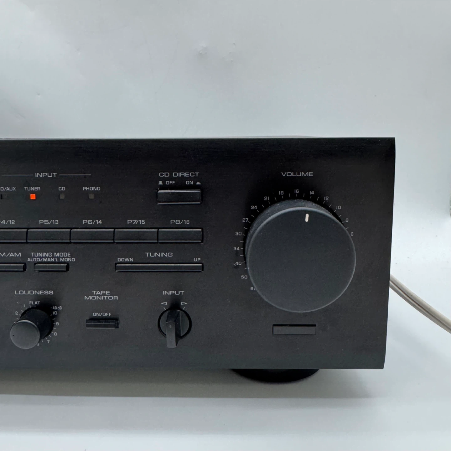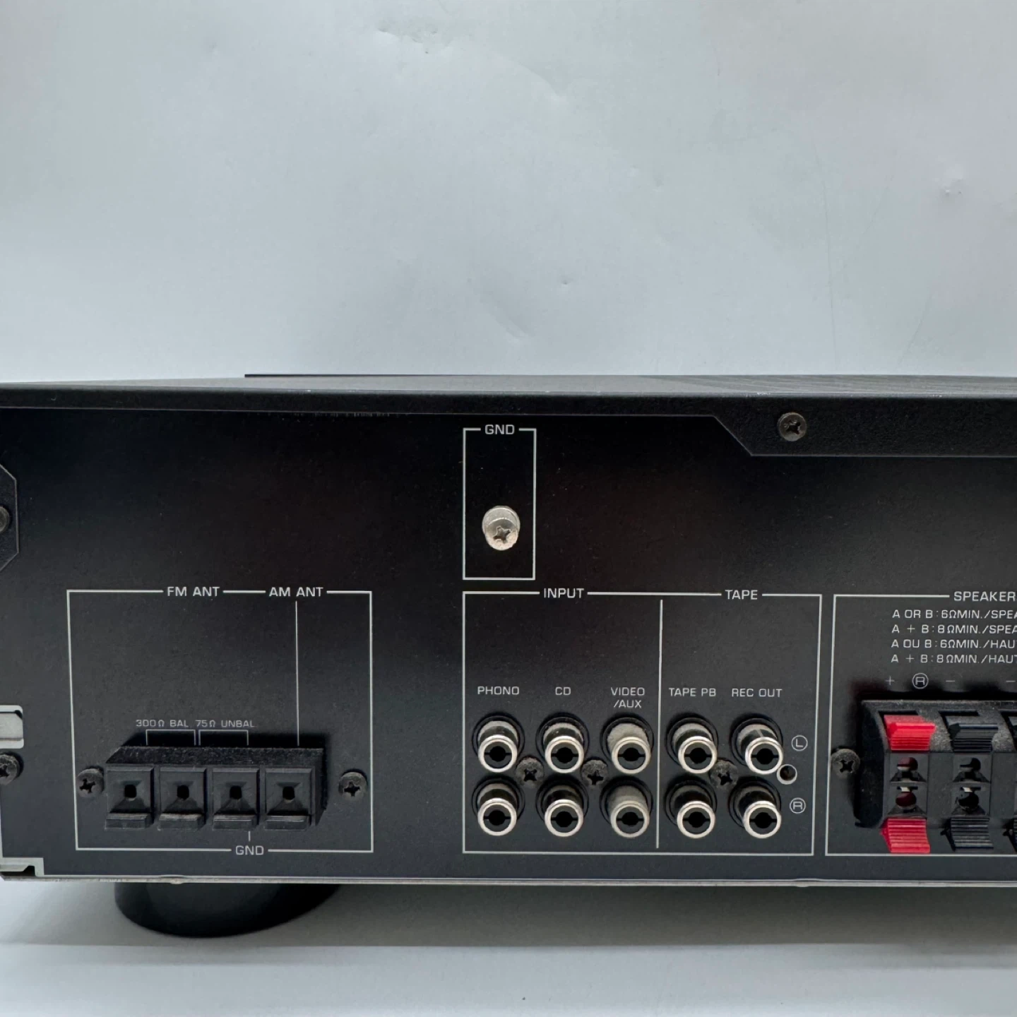 AM/FM tuner works properly and all main controls respond normally. It features multiple inputs including Phono, CD, Video/AUX, and Tape, allowing connection to a variety of audio sources. Speaker A/B outputs and a headphone jack are also included.