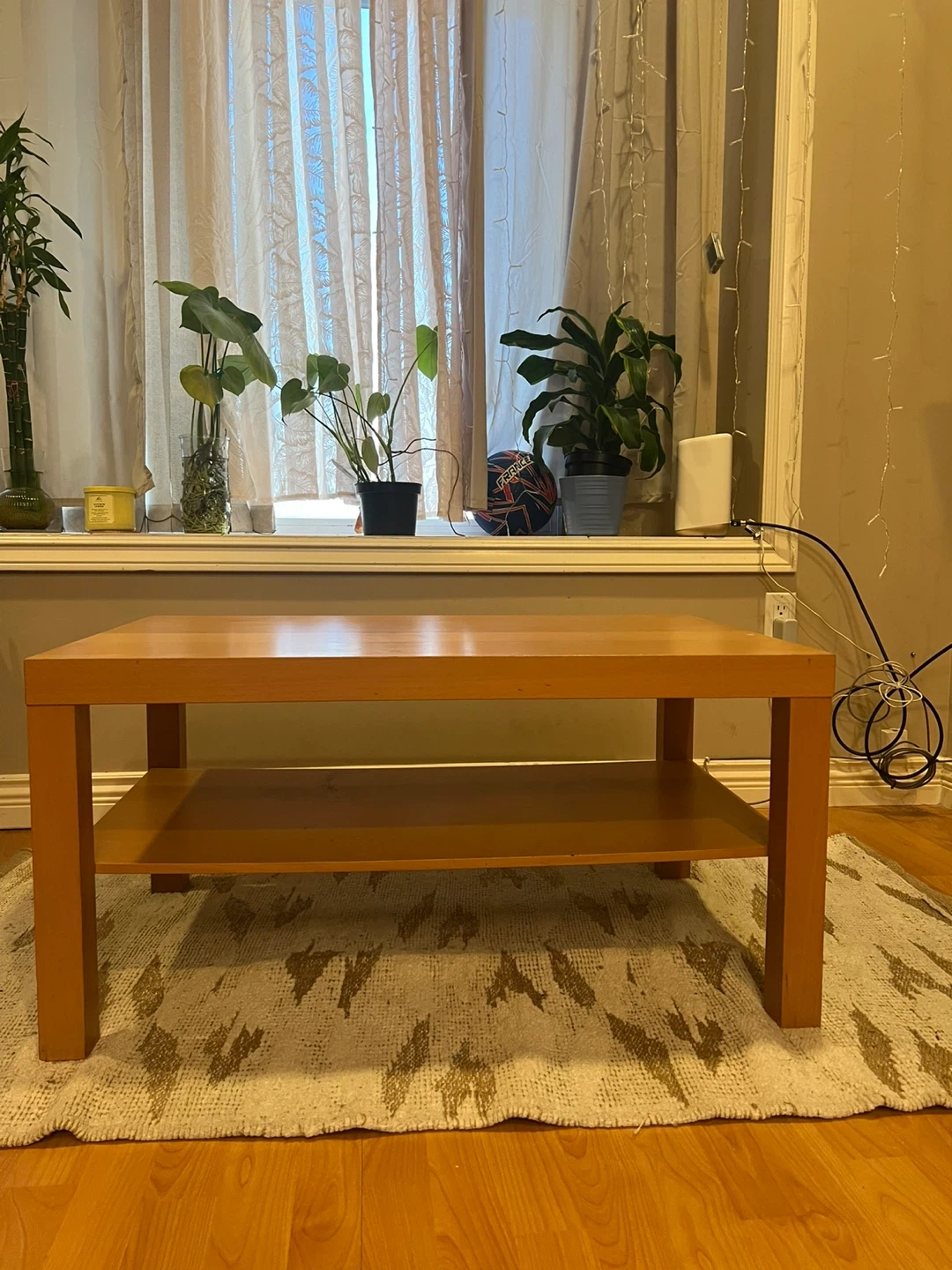 This is a light wood coffee table with an extra shelf for storage. It's a simple and practical piece for your living room. This table would be useful for holding drinks, remotes, or decorative items.
