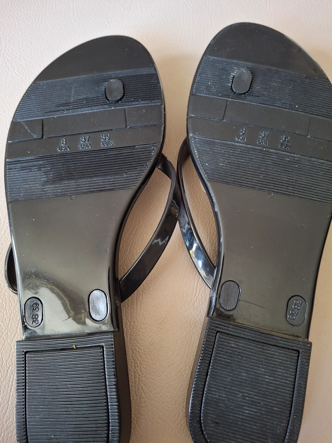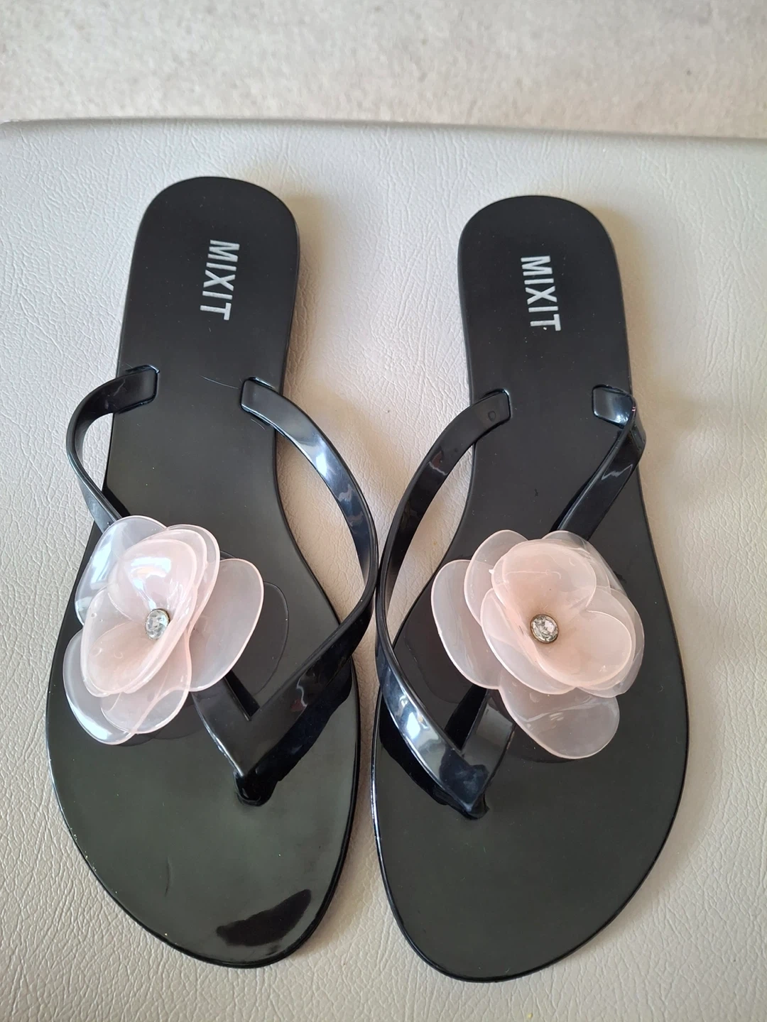 Black flat sandals/flip flops with cute pink flower detail. MIXIT brand. Never been worn. Size 8, Eur 39. One small indent on right shoe as shown in last photo.