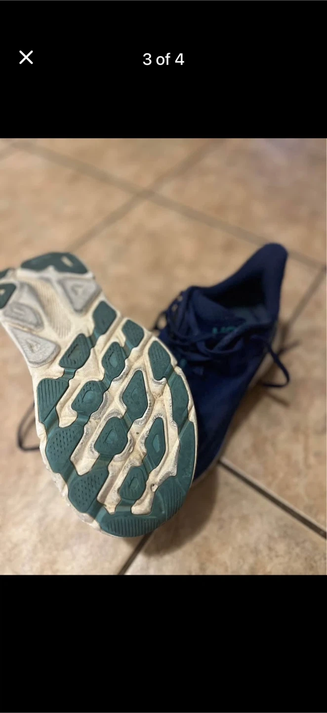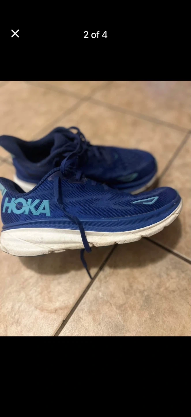 These are a pair of blue Hoka Clifton running shoes. They're designed for comfort and performance. Good for road running!
