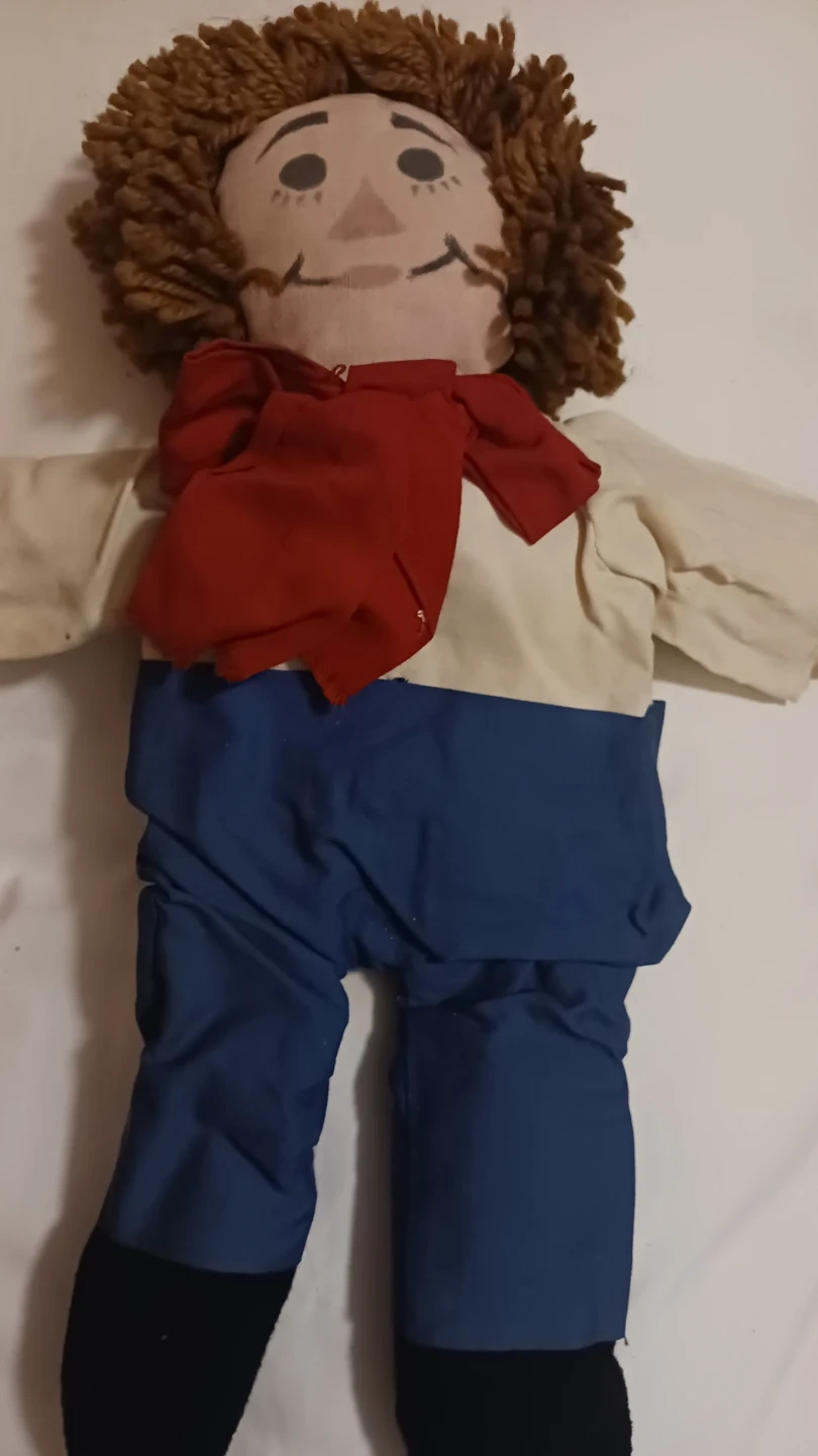 Vintage Raggedy Ann and Andy fabric dolls. Both dolls have yarn hair, button eyes, and embroidered smiles. They're dressed in coordinating outfits. Andy wears a red scarf, white shirt, blue pants, and black socks. Ann wears a green patterned crinoline and a tan dress with ruffled trim. These dolls are made of fabric with soft stuffing. They are not meant to be played with at almost 50 years old. Sold separately in price but as a pair $40.