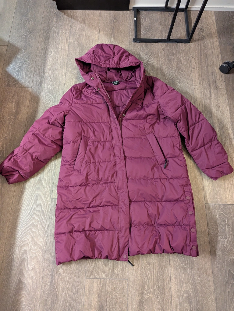Women's burgundy mid-length XXL water-resistant hooded puffer jacket. Hood is not detachable. Snap buttons on the side for comfortable seating, walking and movement. Drawstring at the bottom. Two pockets with zipper. From zipper and buttons.