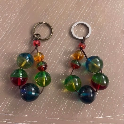 Pair of vintage glass beaded keychains featuring colourful retro-style beads in green, blue, red, and amber tones. Unique circular bead design with metal key rings.
