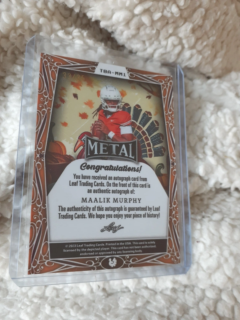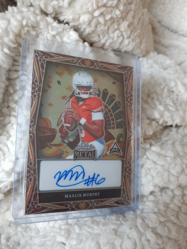 I'm selling a Maalik Murphy autograph card from Leaf Trading Cards! The card is in great condition and comes in a protective case. It's a unique piece of sports memorabilia for any fan of Maalik Murphy or football in general