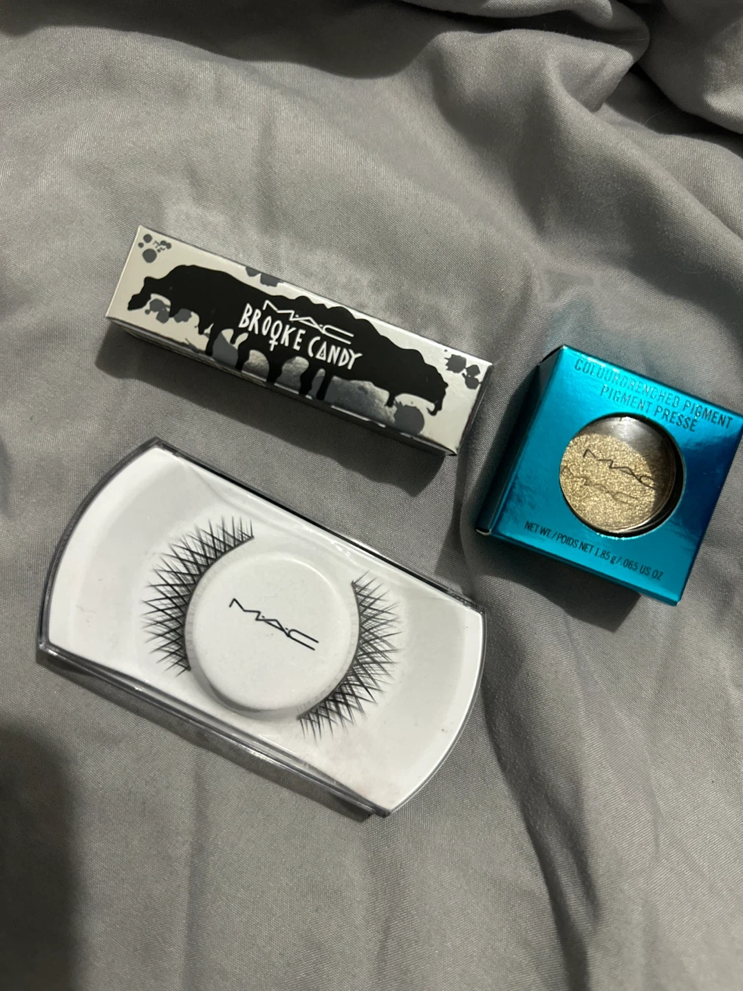 Selling a collection of MAC makeup items! Included are the Brooke Candy lipstick (shade pink),a Colour-Drenched Pressed Pigment, and a set of lashes. The pigment is 1.85 g/.065 US OZ. All items are brand new