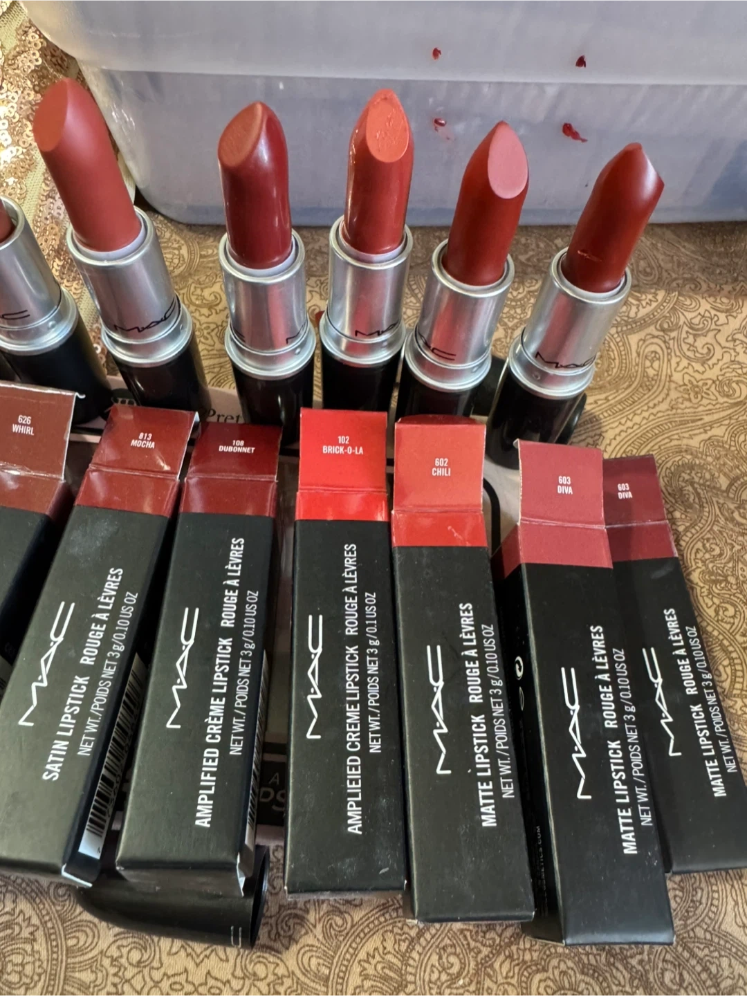 Selling a collection of MAC lipsticks in various shades like Twig, Dubonnet, Brick-O-La, Lady Bug, Mocha, Chili, Diva, Whirl, and Velvet Teddy! Each lipstick is 3g/0.10 US oz