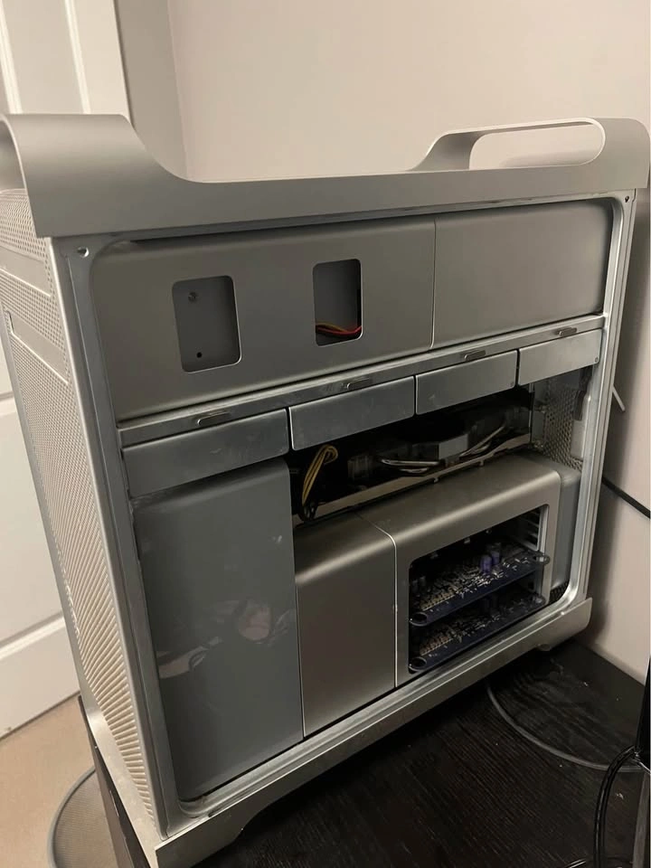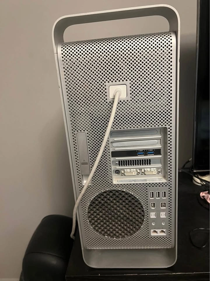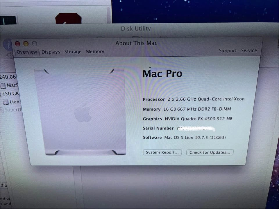23Mac Pro 2,1 - 2 x 2.66GHz Quad Core Xeon (8 cores) 16GB RAM 256GB SSD HD (system is on this drive) 256GB HD 2 additional empty drive bays. Upgraded NVIDIA Quadro FX 4500 graphics card SuperDrive optical drive USB 3 PCI card upgrade FireWire USB 2.0 Gigabit internet AirPort Extreme Tower form factor Currently Running Mac OS Lion 10.7.5 Includes original keyboard and mouse with scroll ball OBO