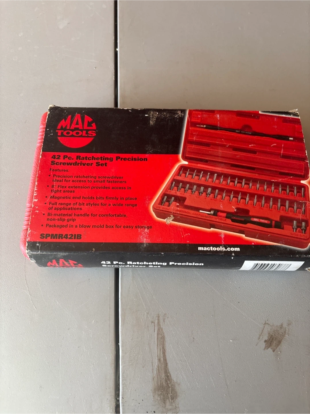 28Selling a MAC Tools 42-piece ratcheting precision screwdriver set! It features a precision ratcheting screwdriver ideal for access to small fasteners. Also included is an 8' flex extension for tight areas. The magnetic end holds bits firmly in place, and there's a full range of bit styles for a wide range of applications. It also has a bi-material handle for comfortable, non-slip grip, and it's packaged in a blow mold box for easy storage