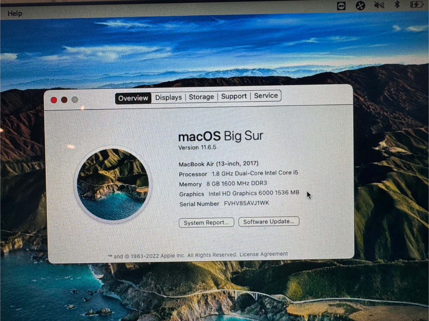 Selling a MacBook Air (13-inch, 2017) running macOS Big Sur Version 11.6.5. It has a 1.8 GHz Dual-Core Intel Core i5 processor and 8 GB 1600 MHz DDR3 memory. Graphics are Intel HD Graphics 6000 1536 MB. Feel free to ask any questions!