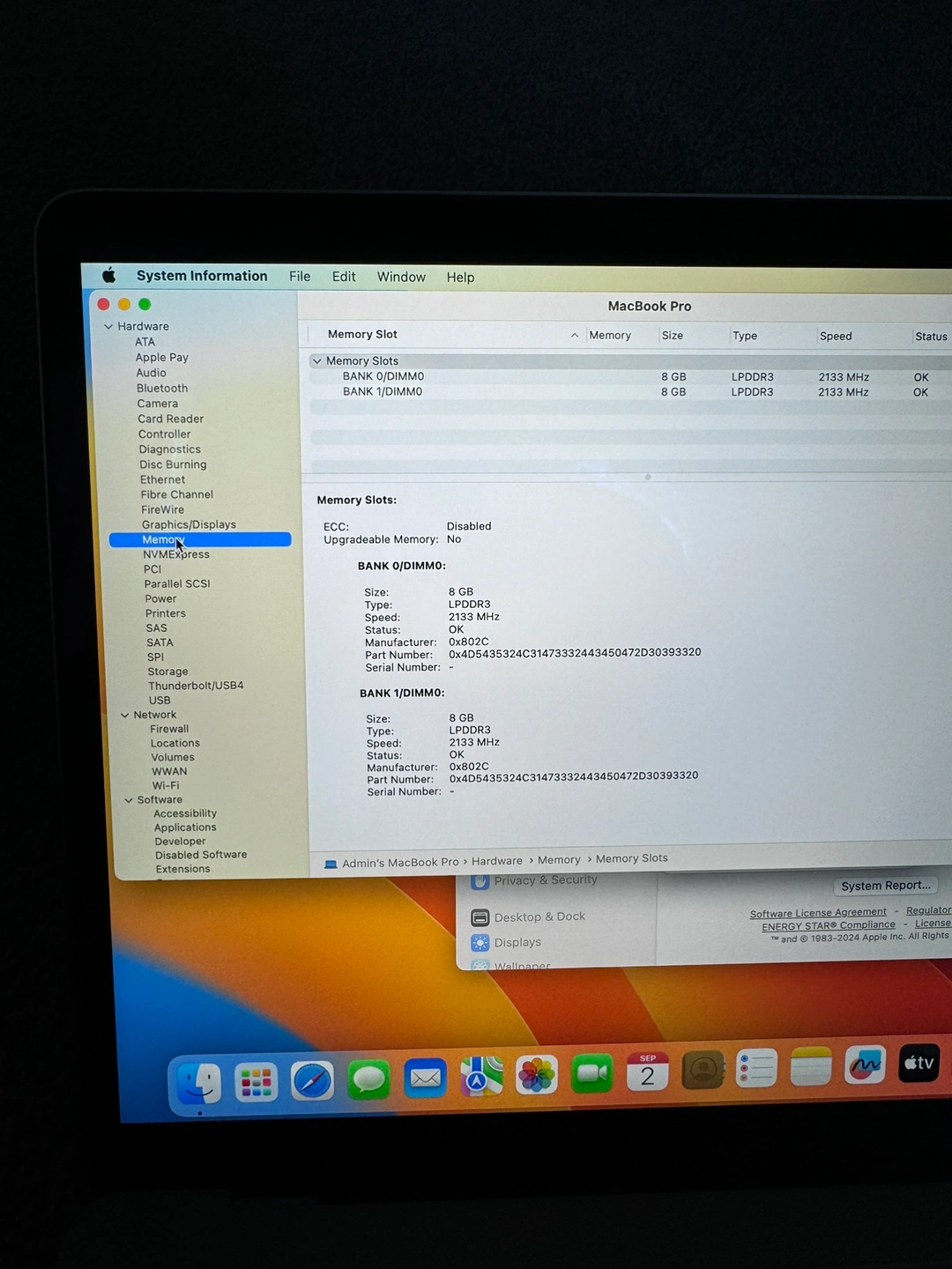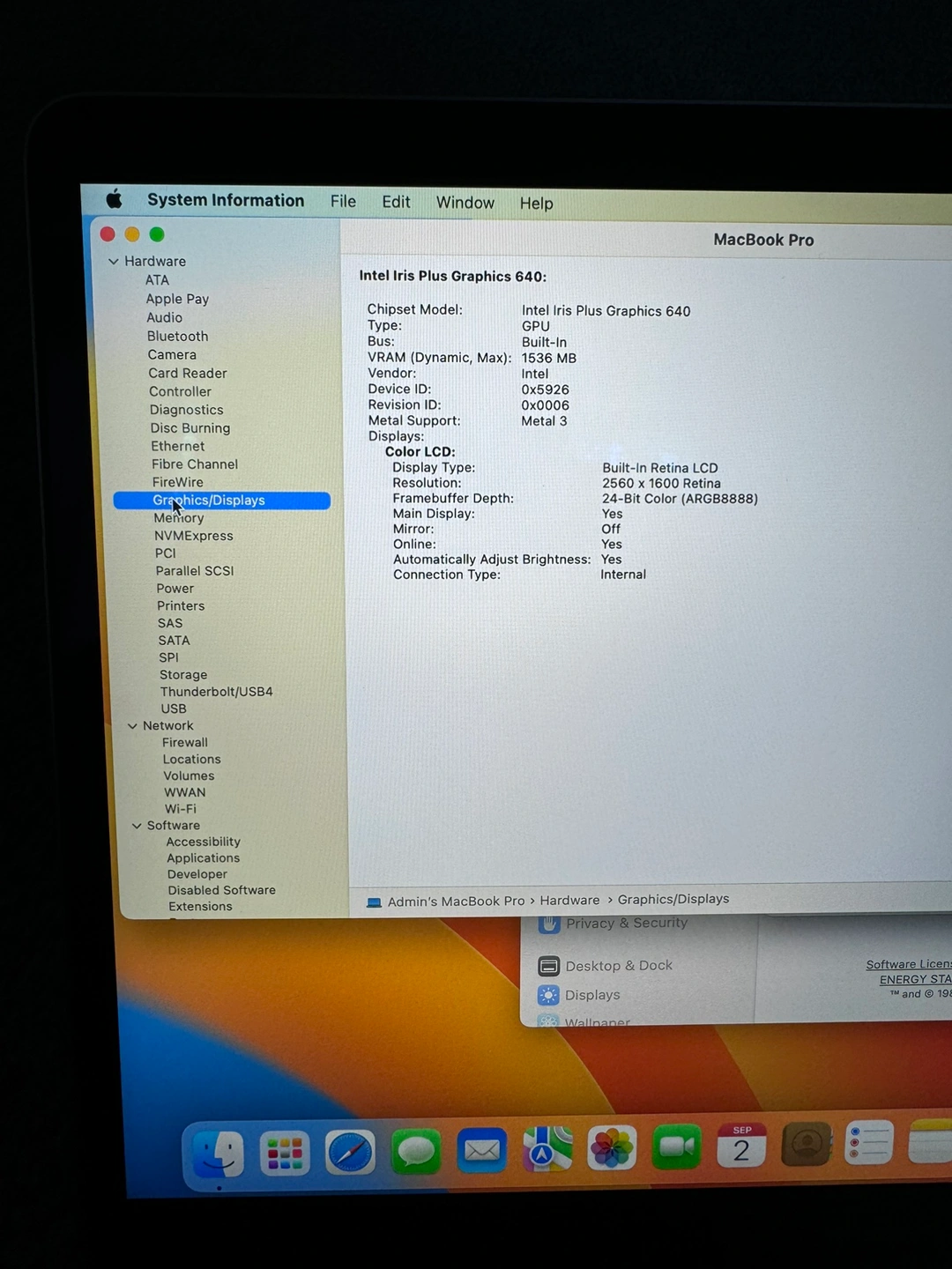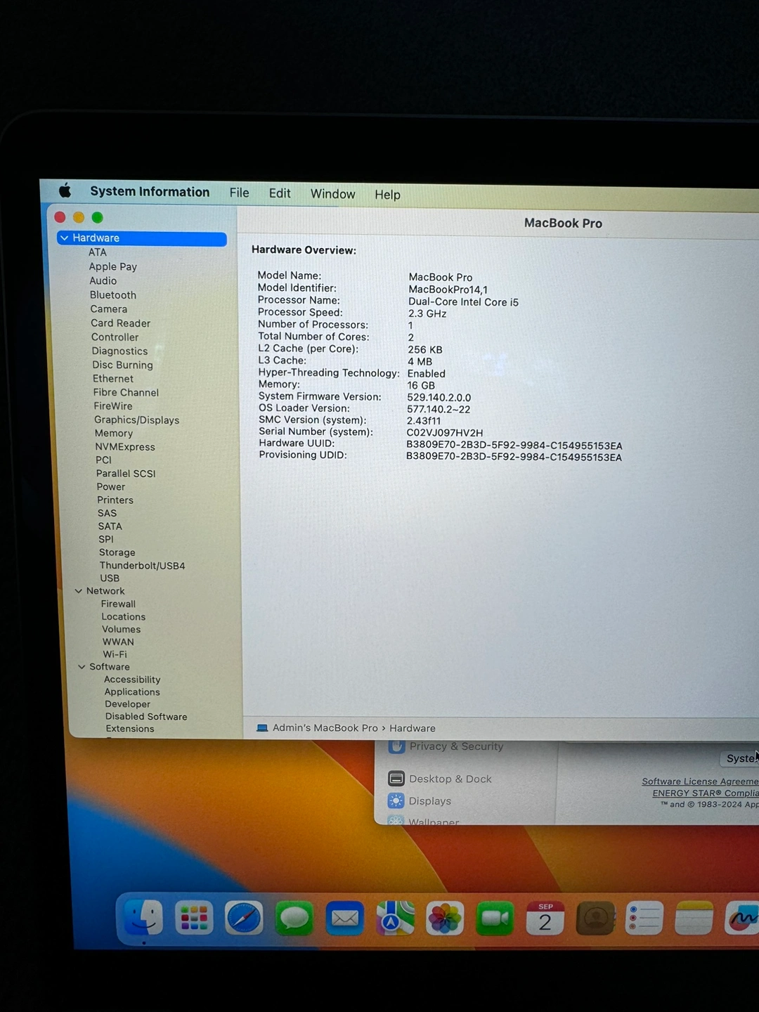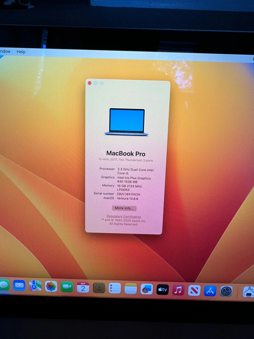 13MacBook Pro 13inch 2017 with 2 Thunderbolt 3 USB - C ports Was purchased in Jan 2018 specifications: • Intel i5 2.3GHz quad - core processor • 16GB ram • 512GB SSD • Intel Iris Plus Graphics 630 • Currently upgraded to Ventura 13.6.9 • Year late 2017 • Space Grey Battery health - Normal- Cycle count - 40 Comes with a power adapter and cord only. Laptop has been fully tested and working perfectly fine. Its in mint brand new like condition. The battery was replaced at Apple store (Eaton Centre) 3 years ago then pretty much never used after that If the ad is still listed, then the item is available.