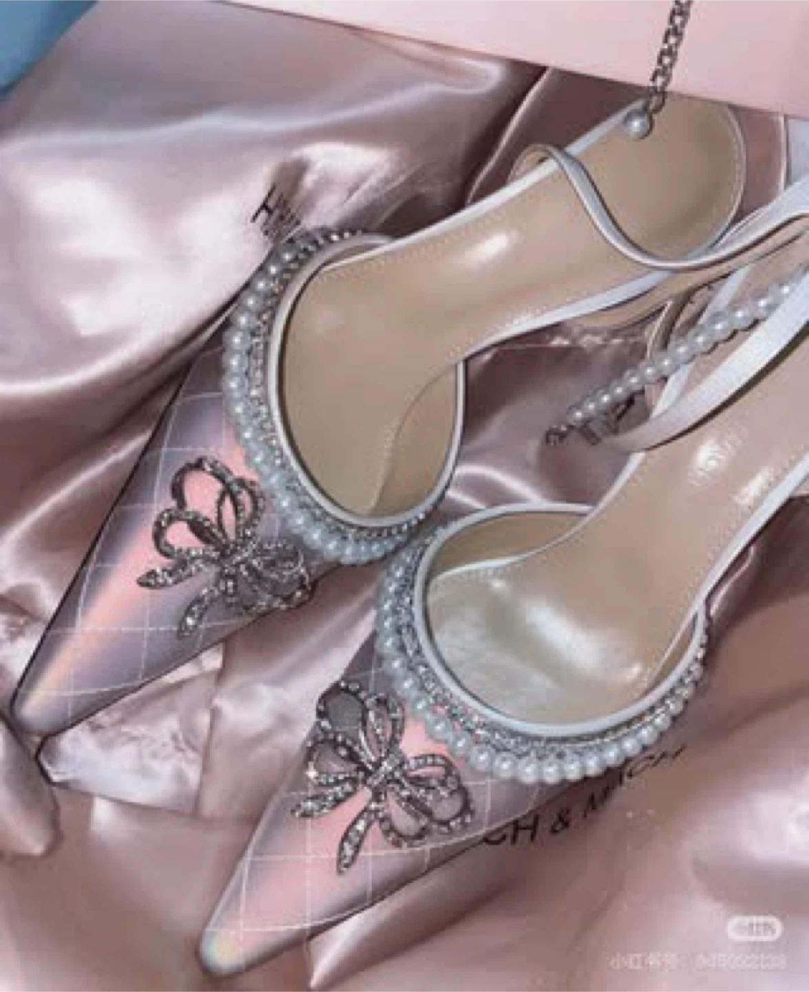 10Gorgeous Mach & Mach heels with pearl and crystal embellishments! These heels are in excellent condition and ready for a new home. They feature a delicate ankle strap and a pointed toe, perfect for a special occasion or adding a touch of glamour to any outfit. Original price $1530 +HST