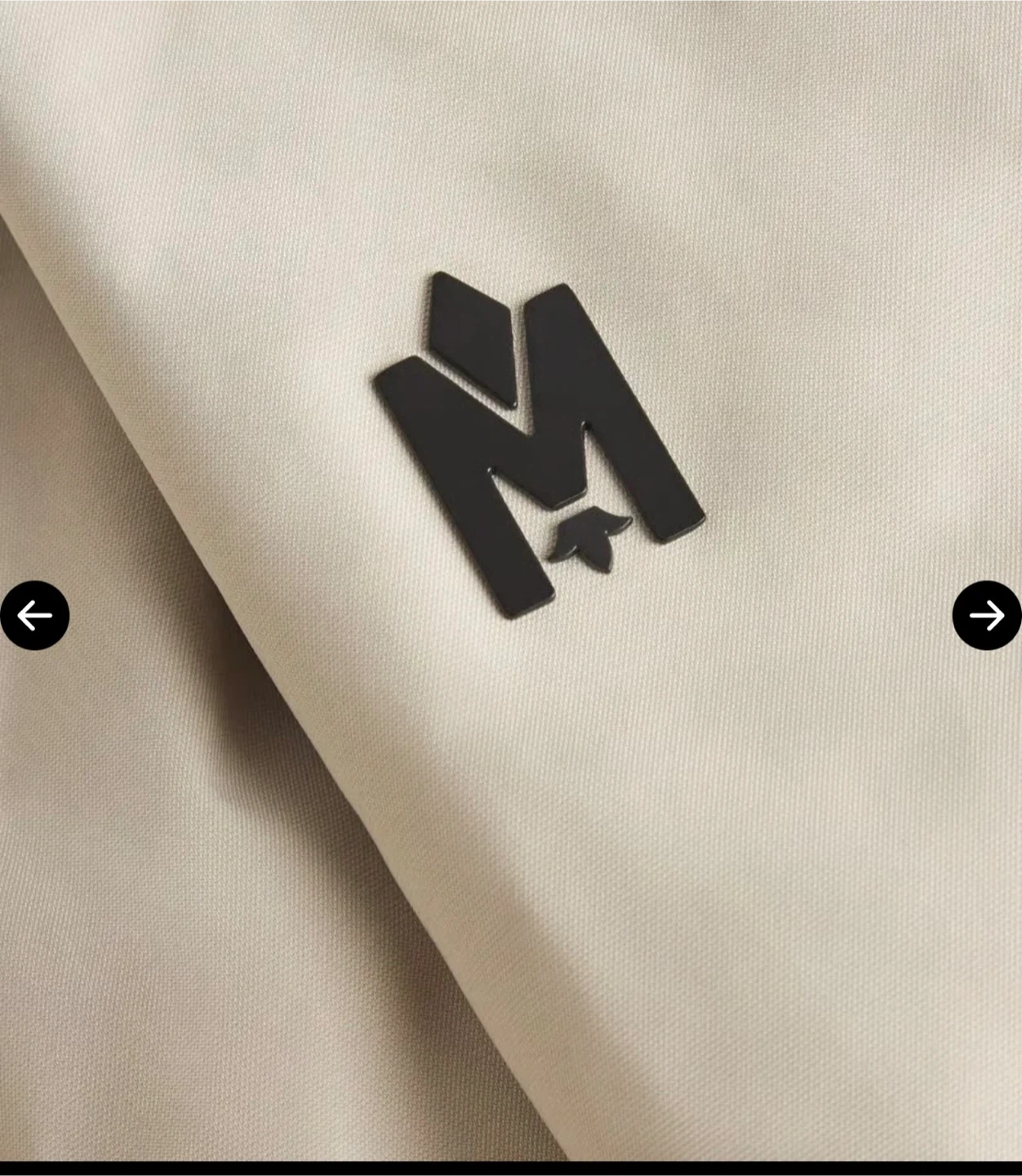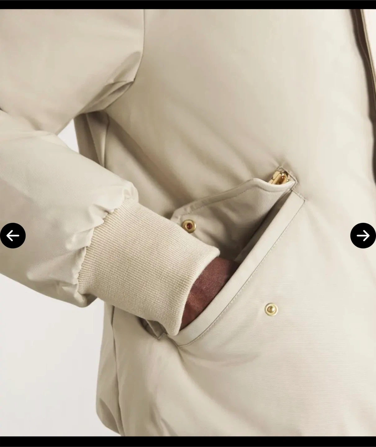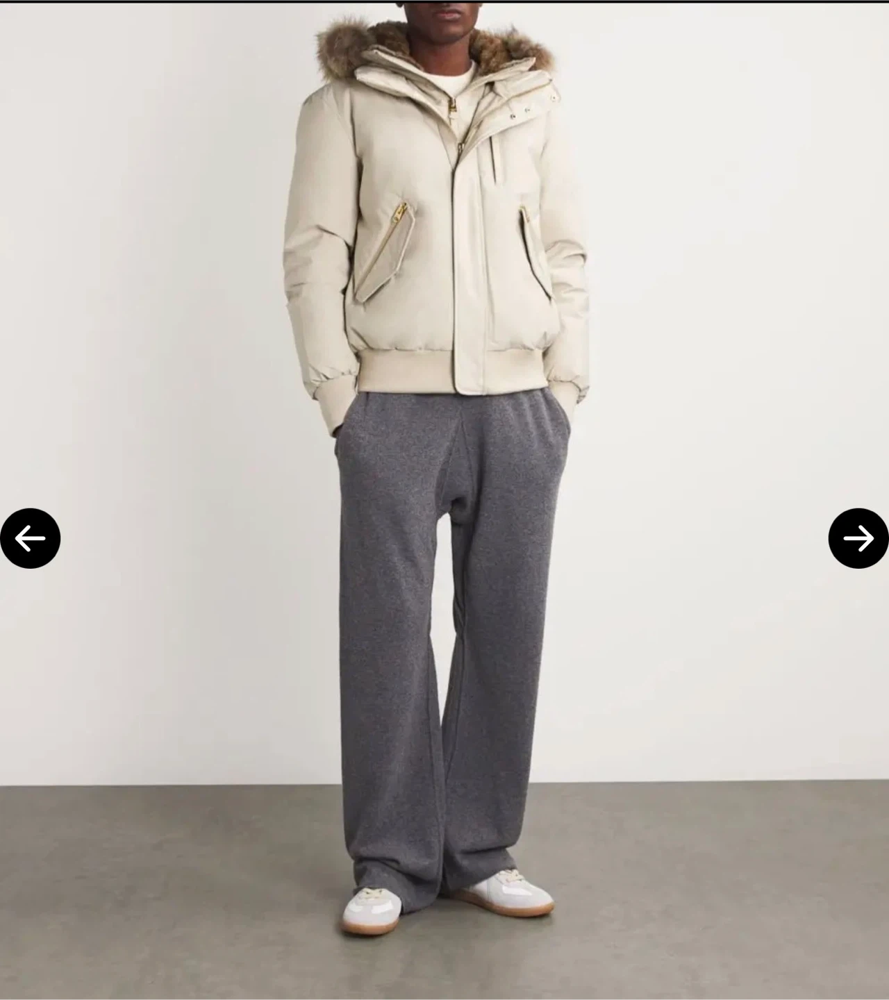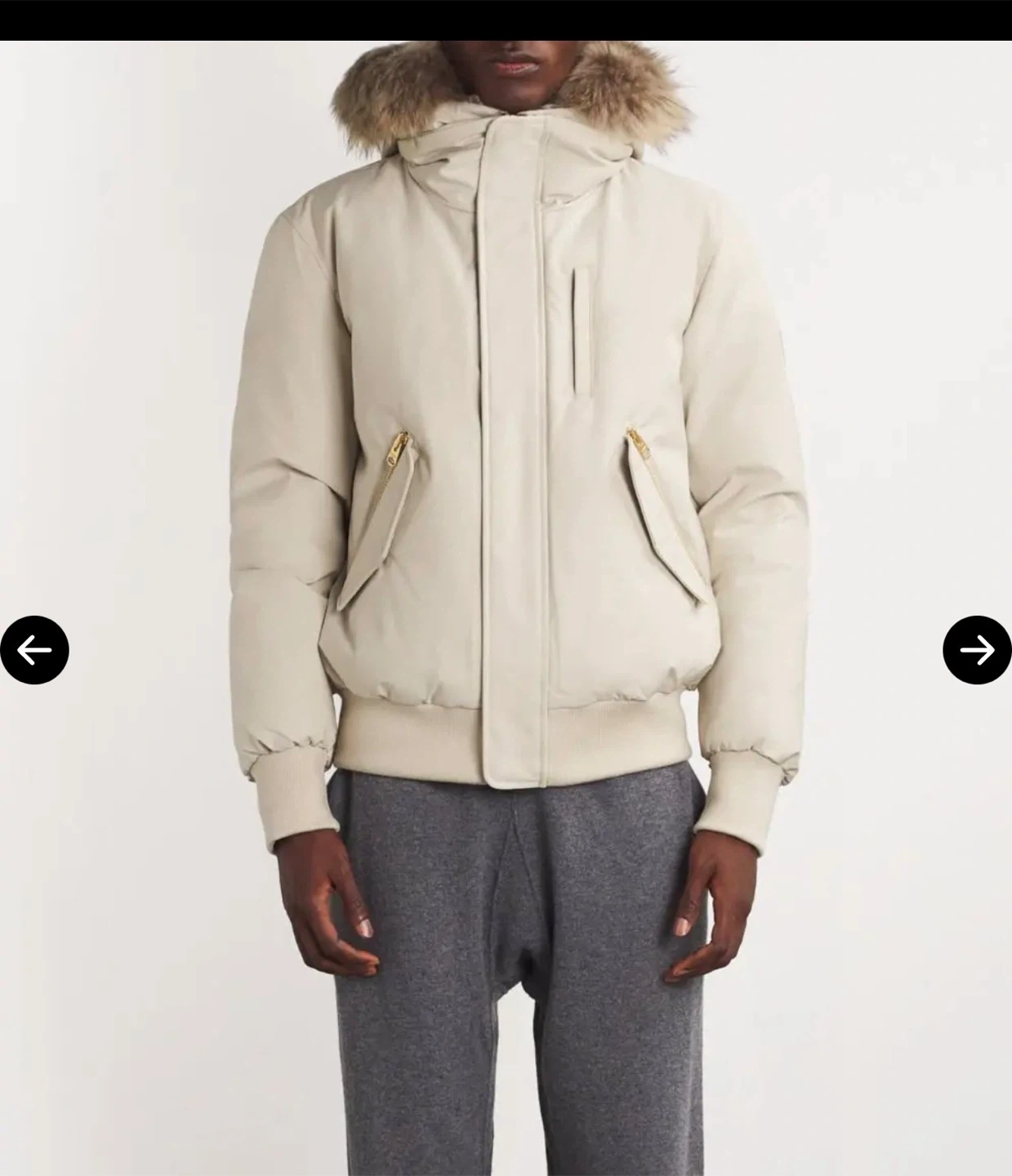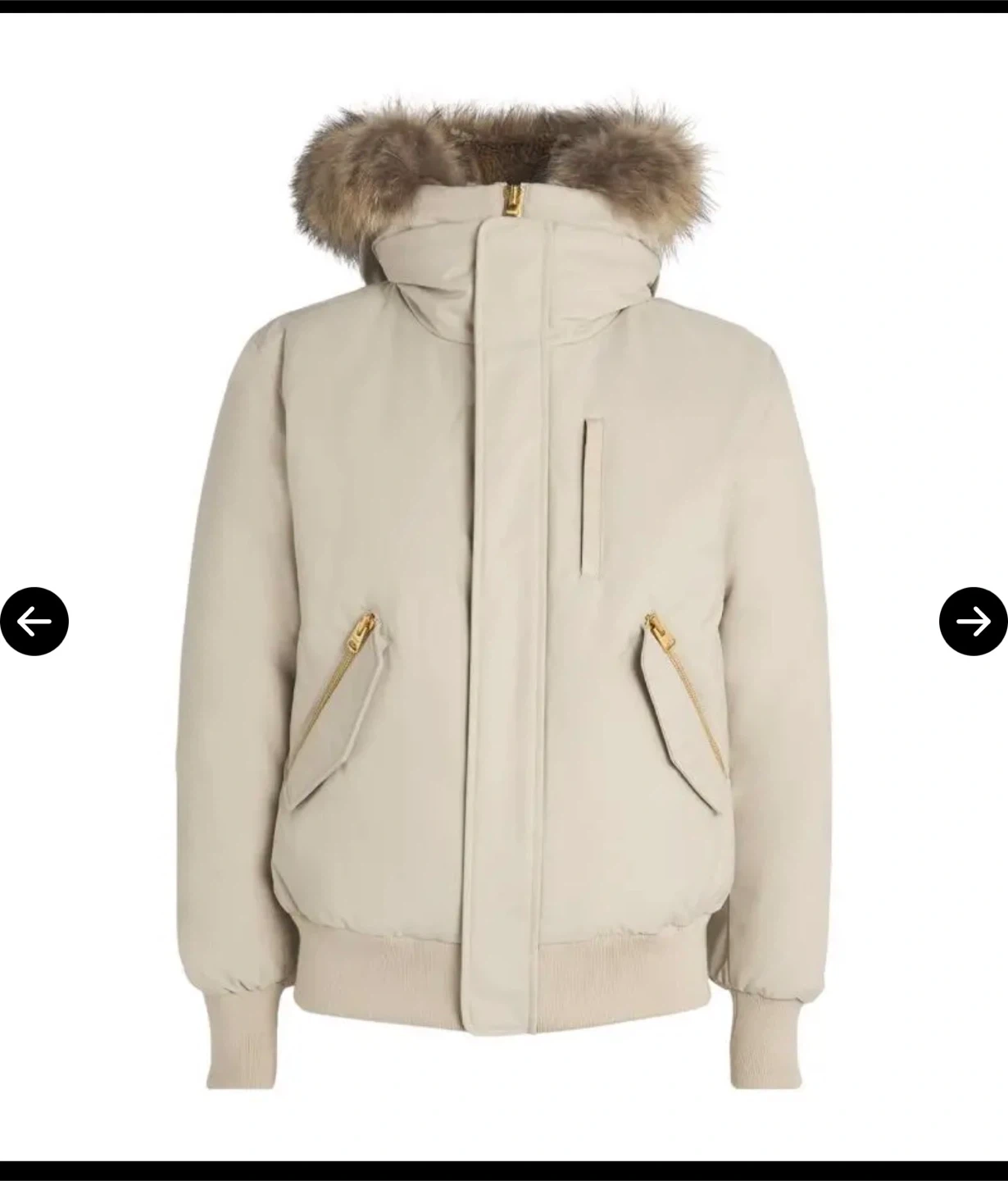 This is a Mackage down bomber jacket in a beige colour. It has a fur-trimmed hood and gold-tone zippers. Perfect for staying warm and stylish!