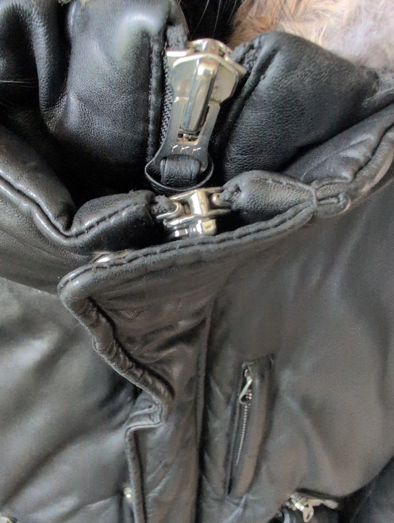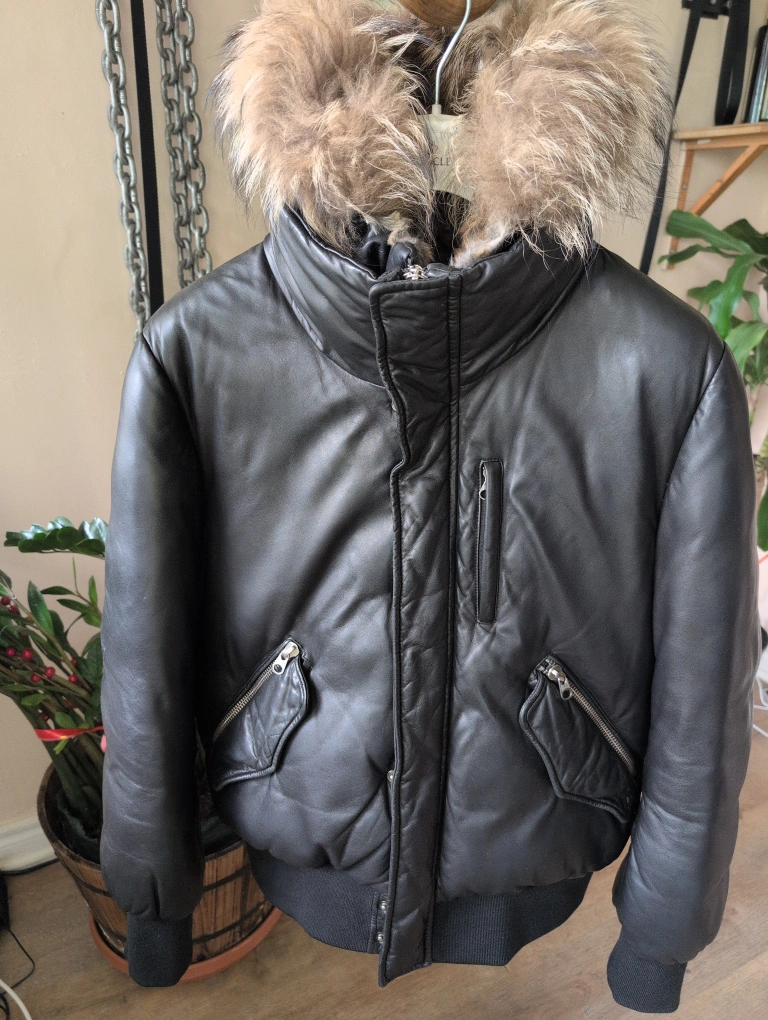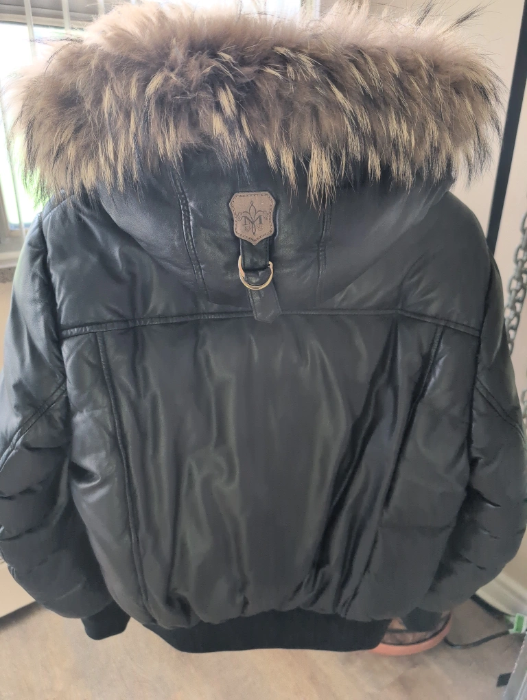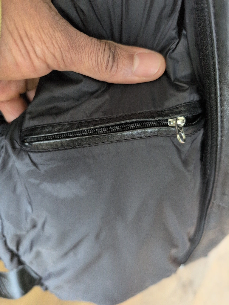 Offering a stylish leather jacket. Has several pockets with zippers. Lining has a quilted pattern. You will be warm and cozy in this jacket during the cold winter months.