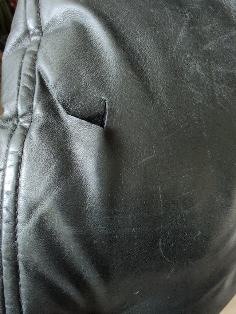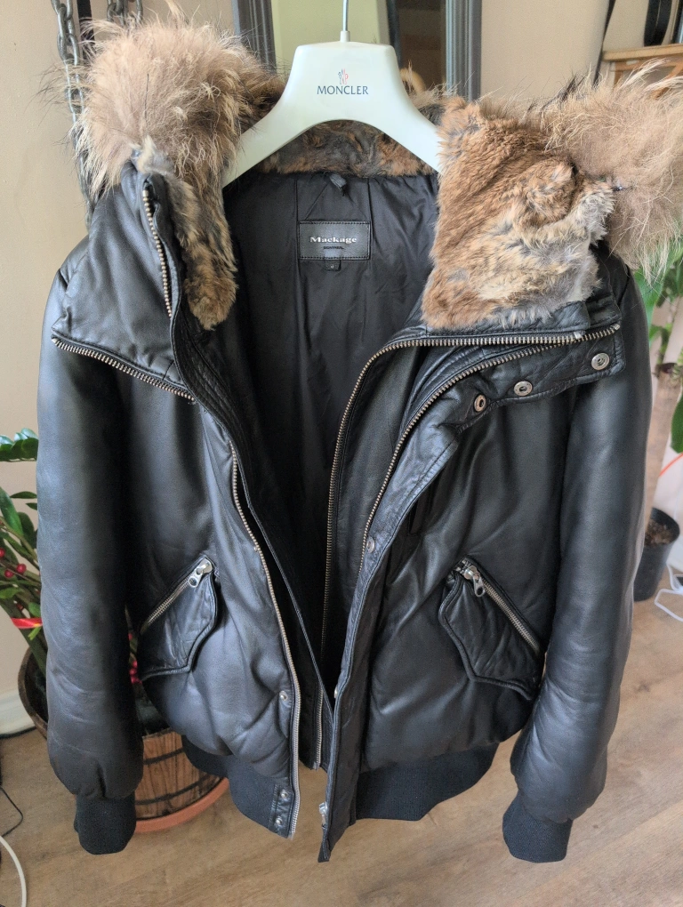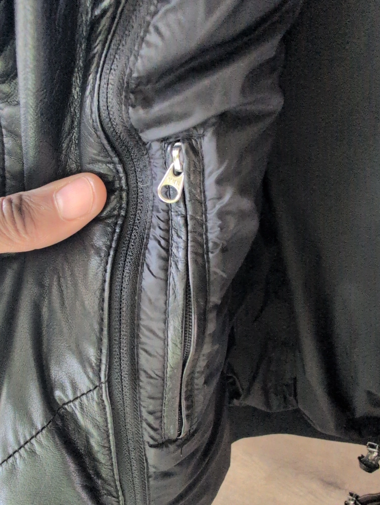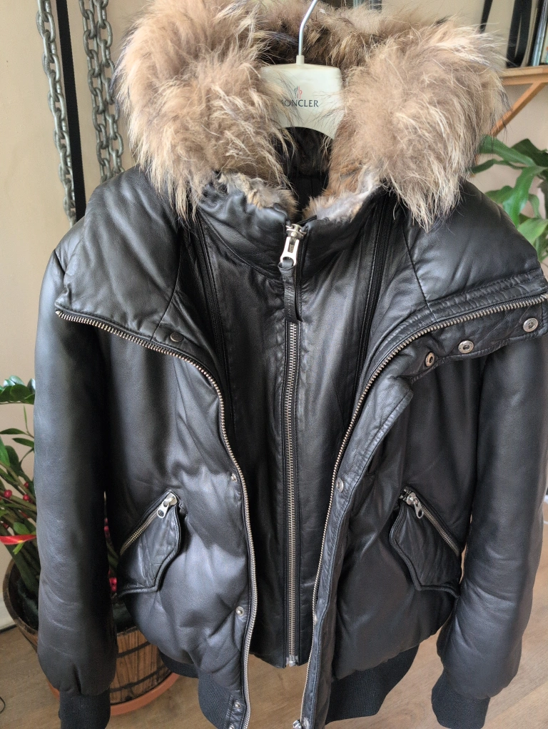 Offering a stylish leather jacket. Has several pockets with zippers. Lining has a quilted pattern. You will be warm and cozy in this jacket during the cold winter months.