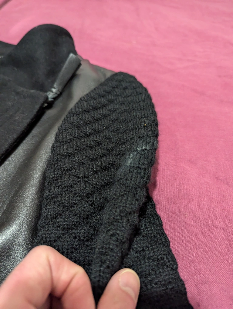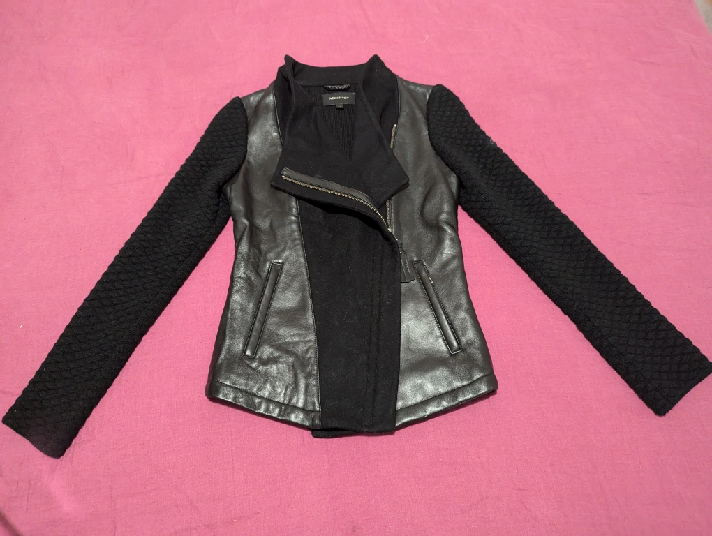 95Black leather jacket with a quilted knit body and sleeves. Features an asymmetrical zipper closure and a collar that can be worn up or down. Small flaw on upper left sleeve, shown in pics. Price is reflective.