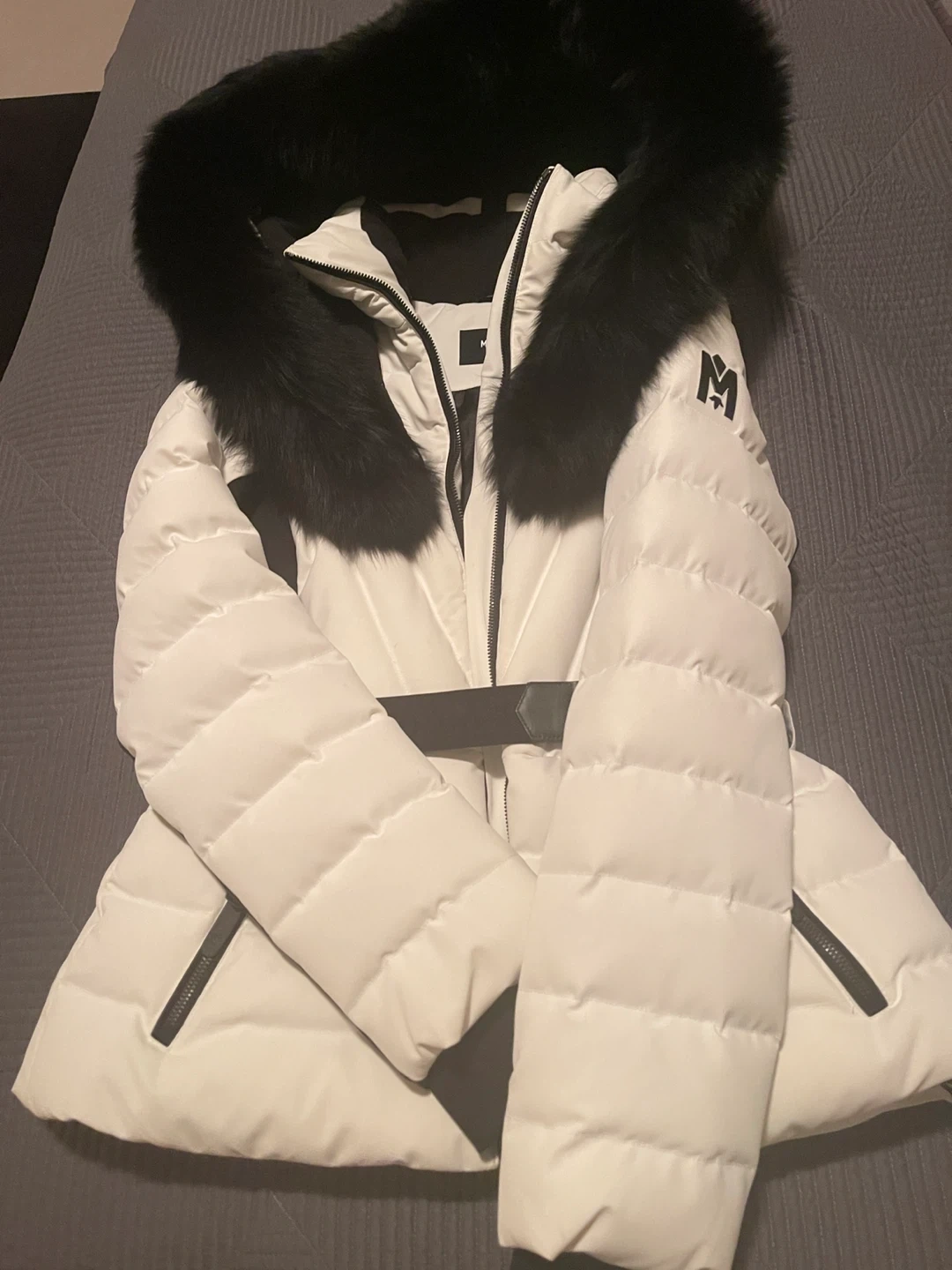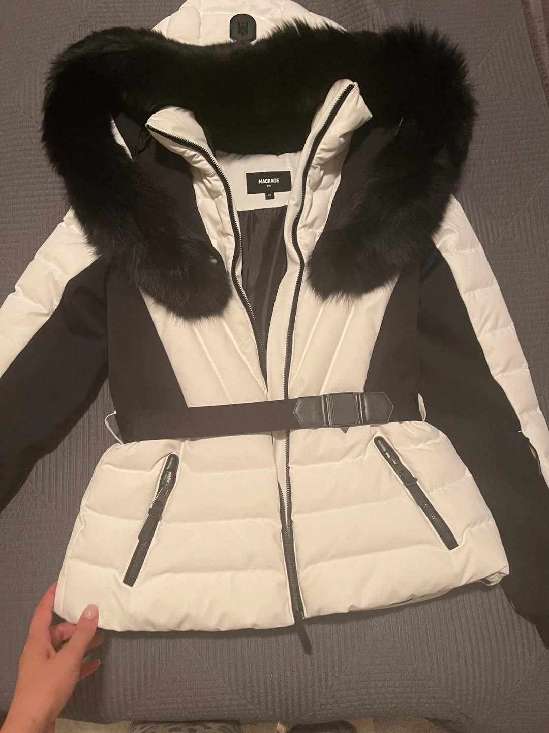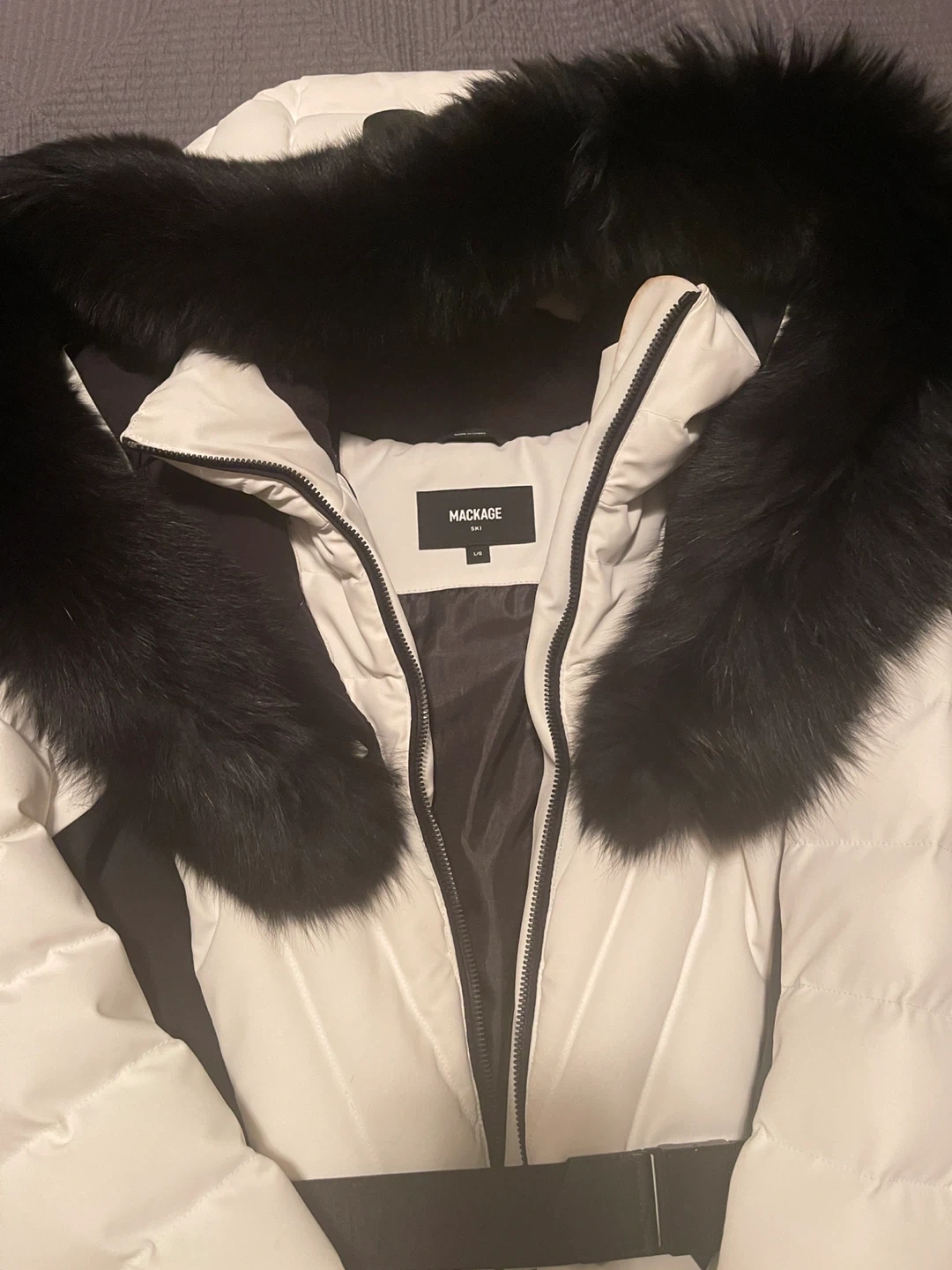 Selling my Mackage women’s winter jacket, worn only once. • Condition: Like new • Size: Large (fits more like a Medium) • Color: Black & white with detachable fur-trimmed hood • Original Price: $1,300 • Asking Price: $850 This is a premium, high-quality winter jacket — warm, stylish, and perfect for Canadian winters.