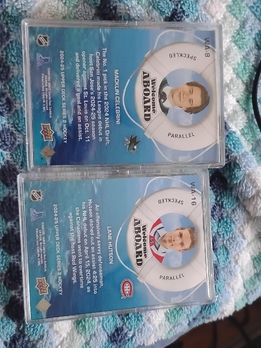 732 premier Rookie speckled parallels for sale! Macklin Celebrini and Lane Hutson 100 for both ! near mint pick up queen n beech ave