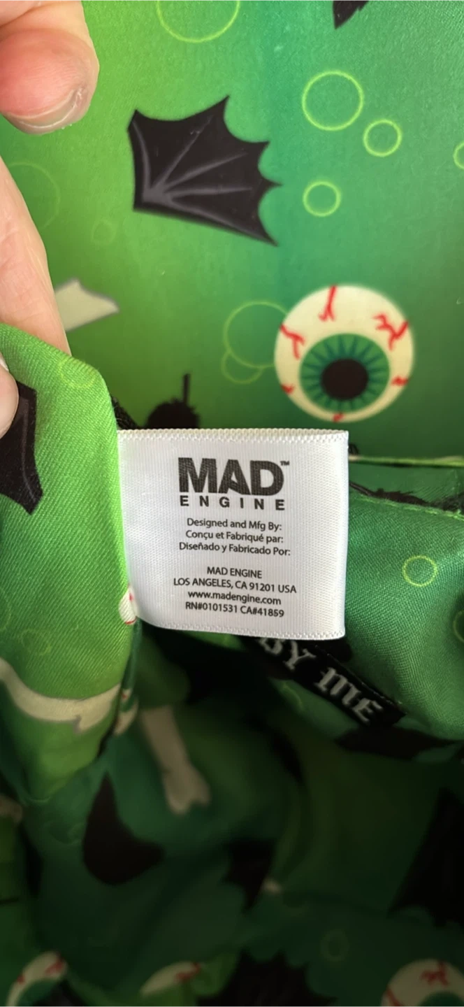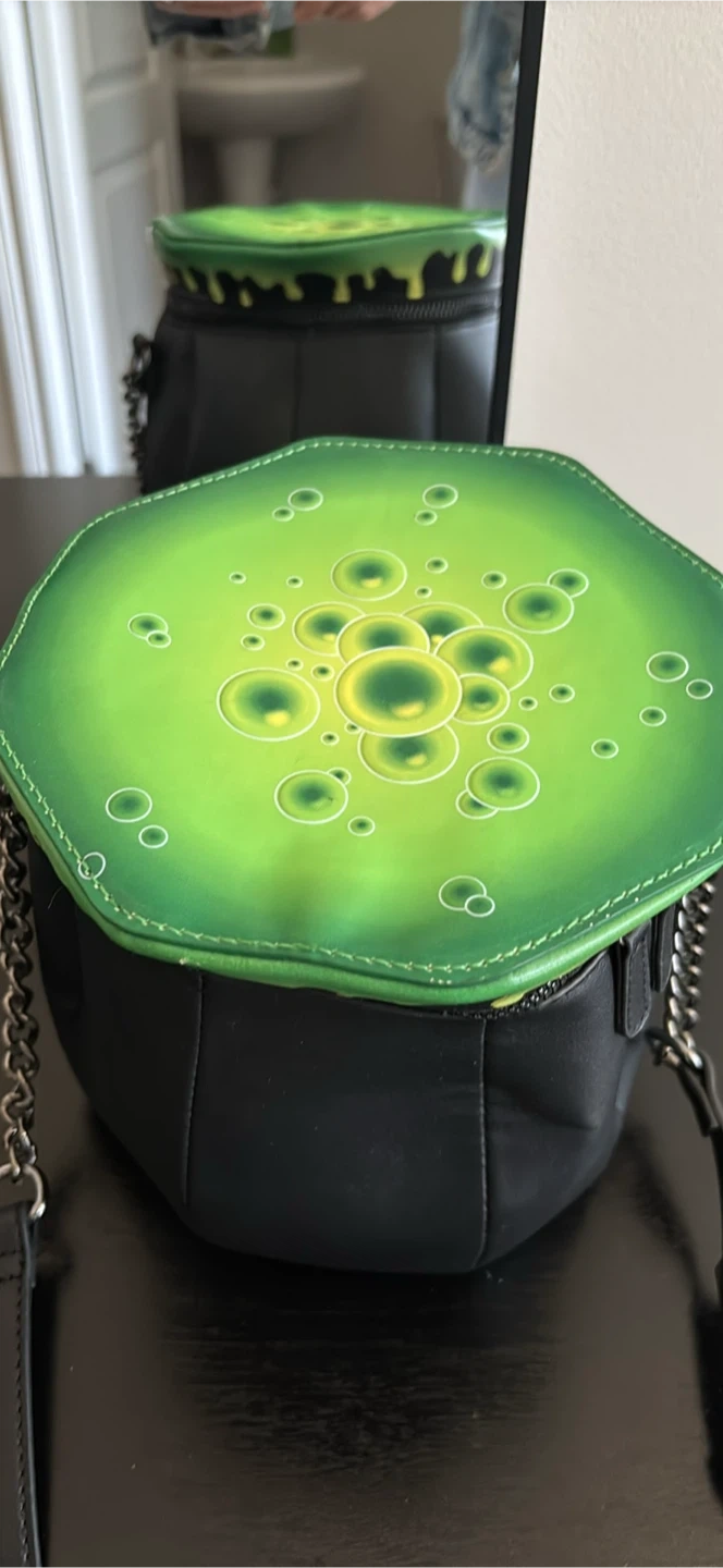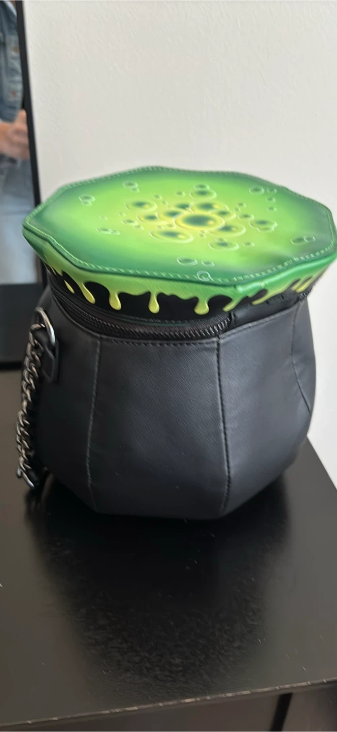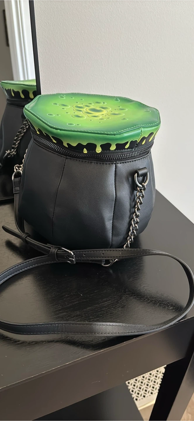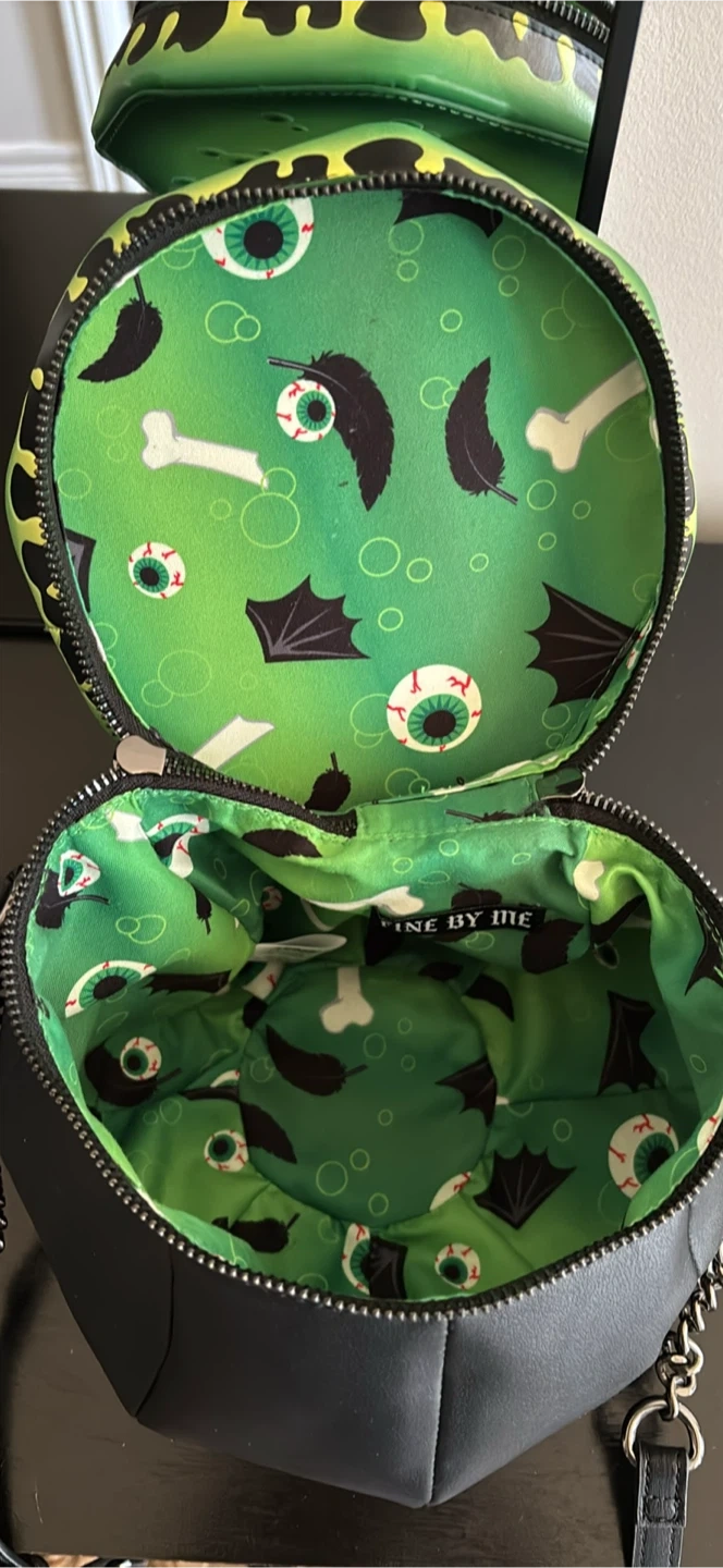 Super cute Mad Engine cauldron crossbody bag! It's black with a green top that looks like bubbling potion. The inside lining is green with spooky Halloween themed designs. Has a chain and adjustable strap
