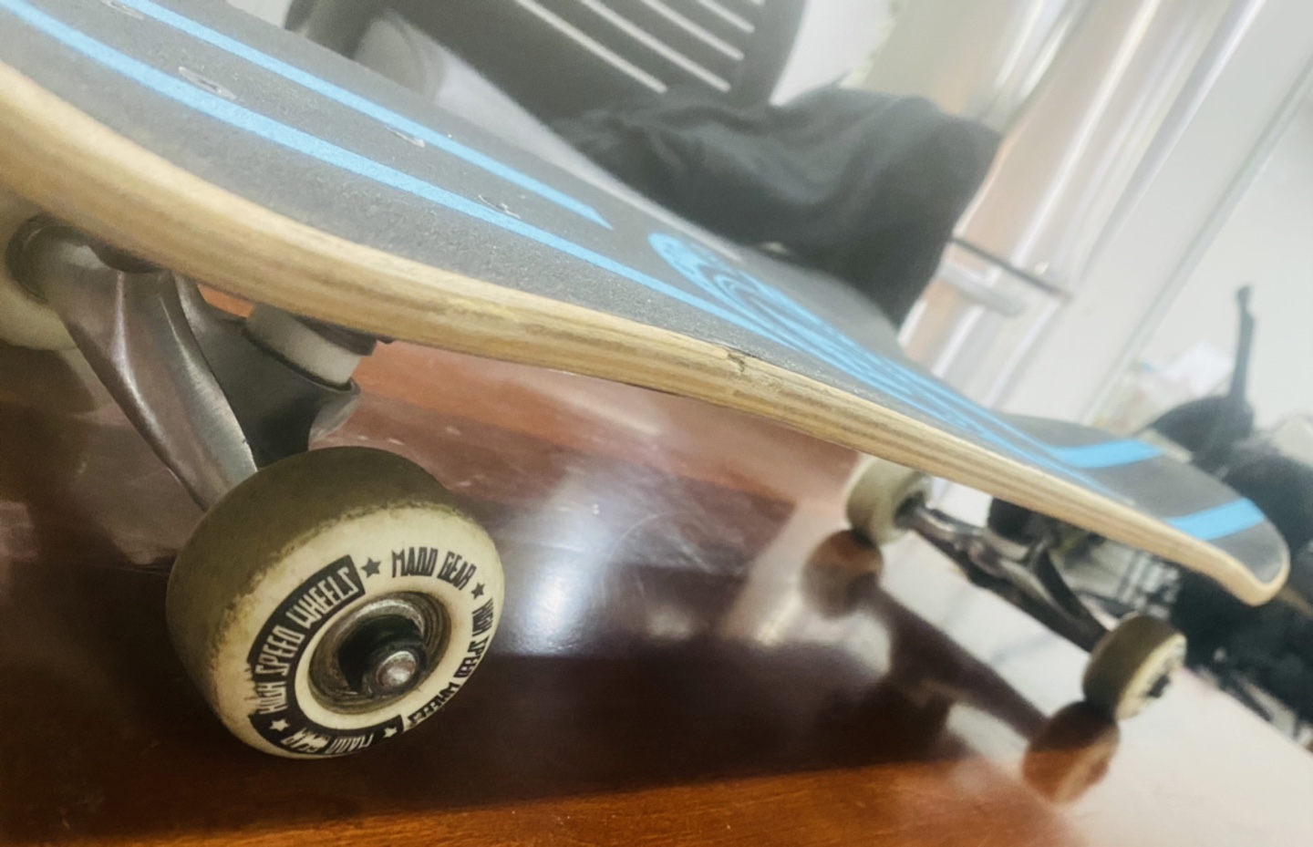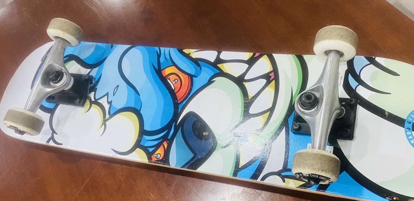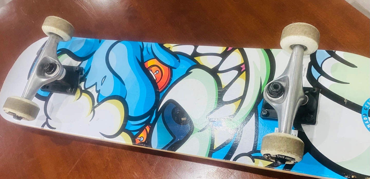 Skateboard with blue stripes. Includes wheels, trucks and bearings.