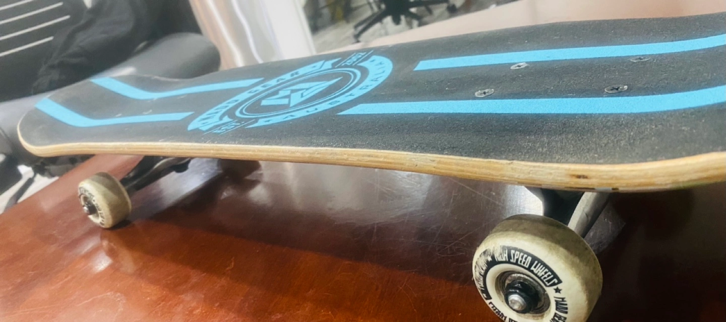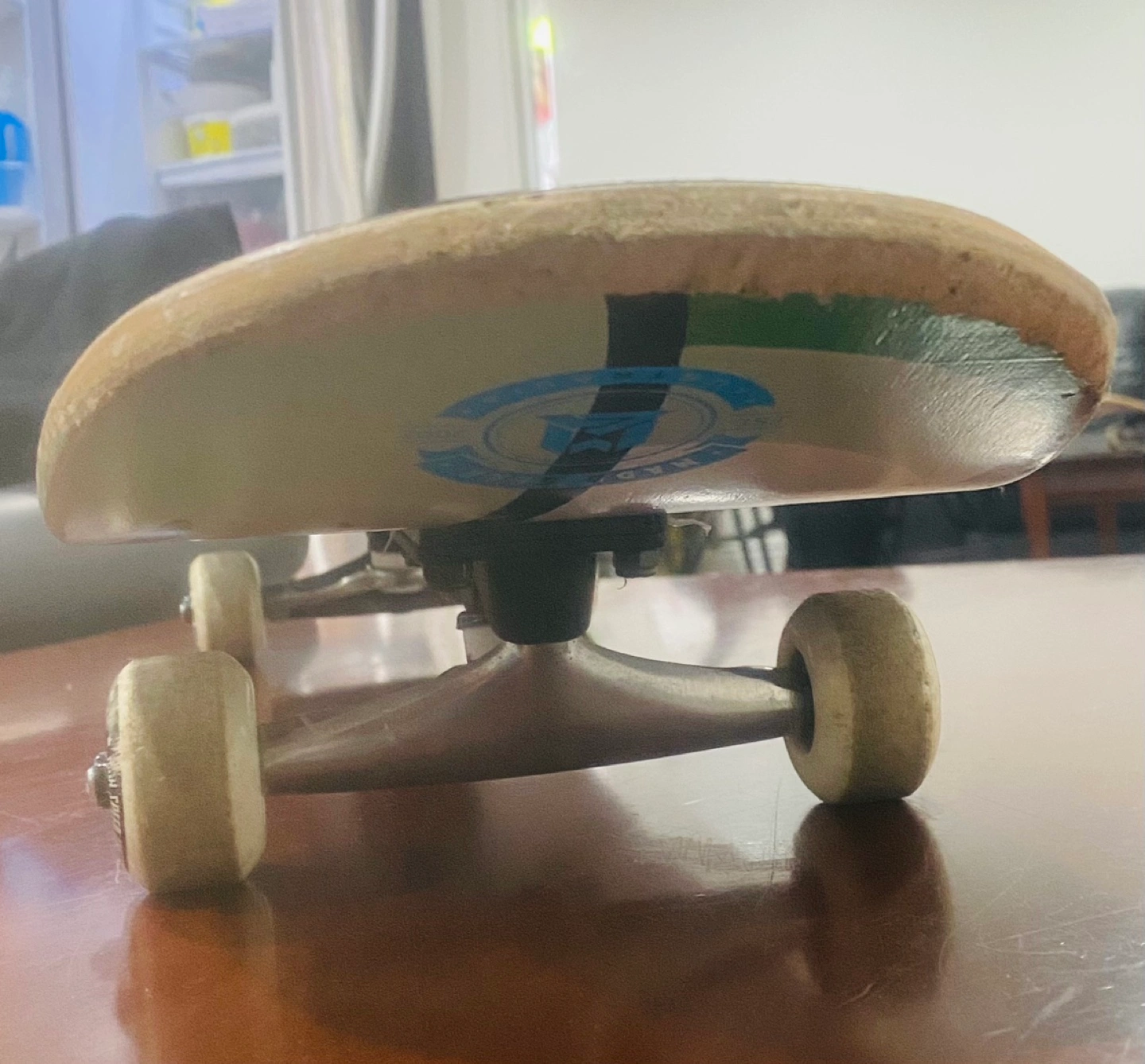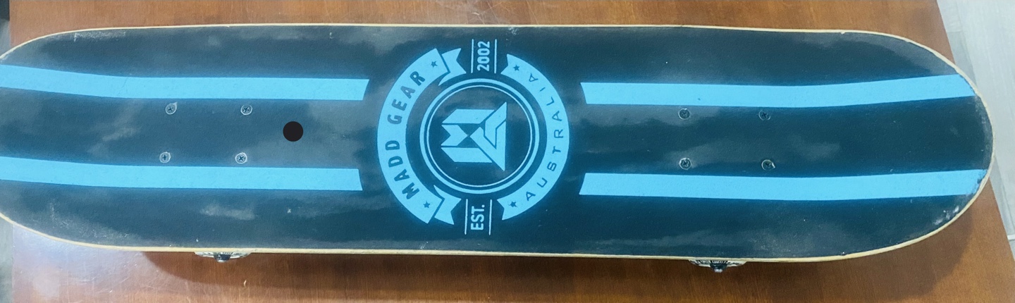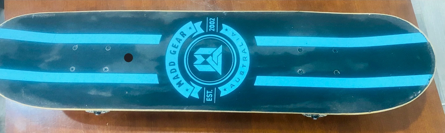 Skateboard with blue stripes. Includes wheels, trucks and bearings.