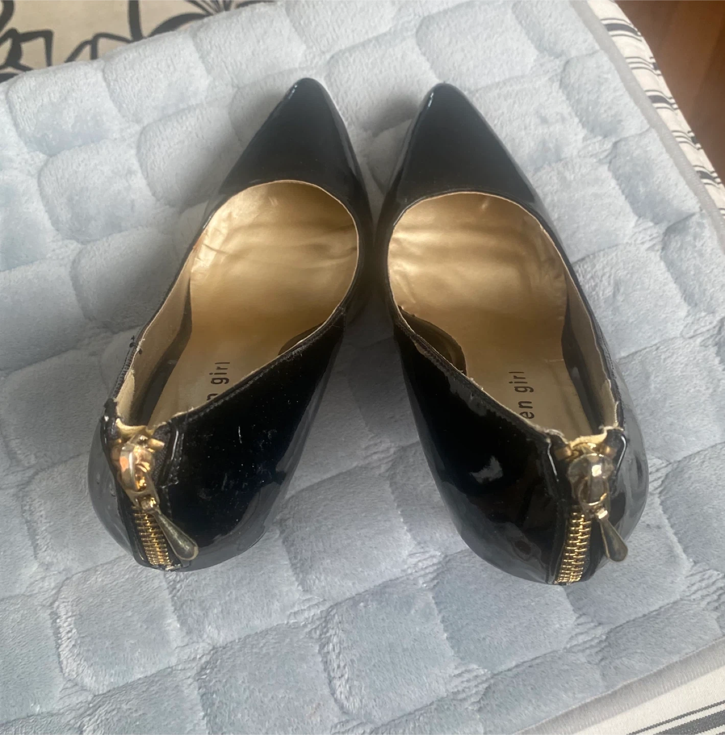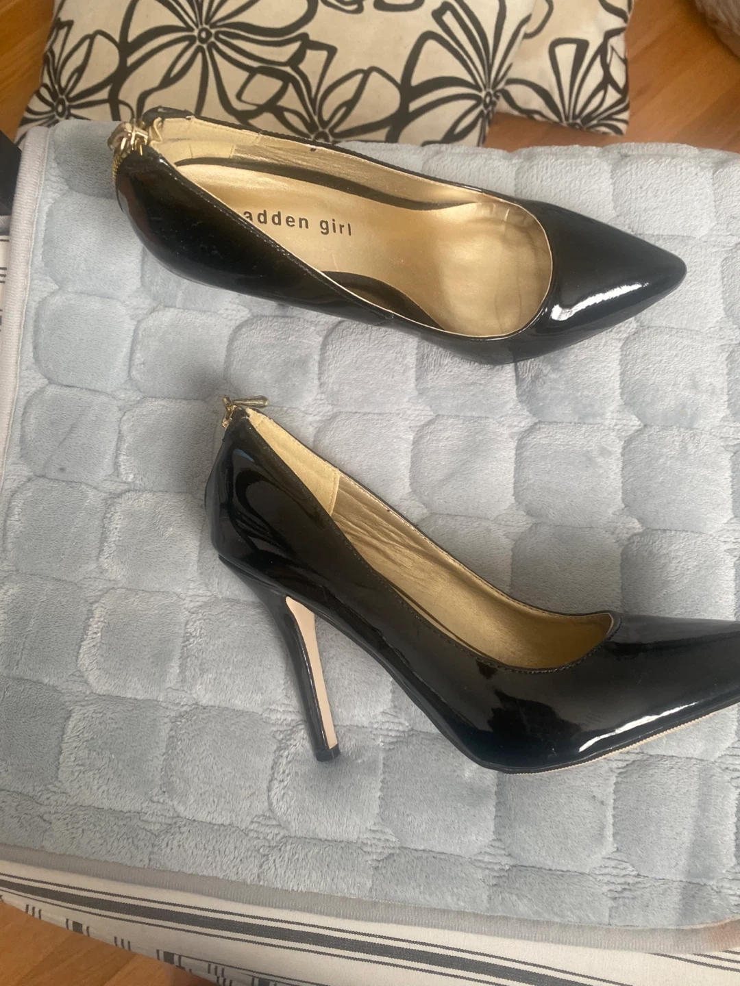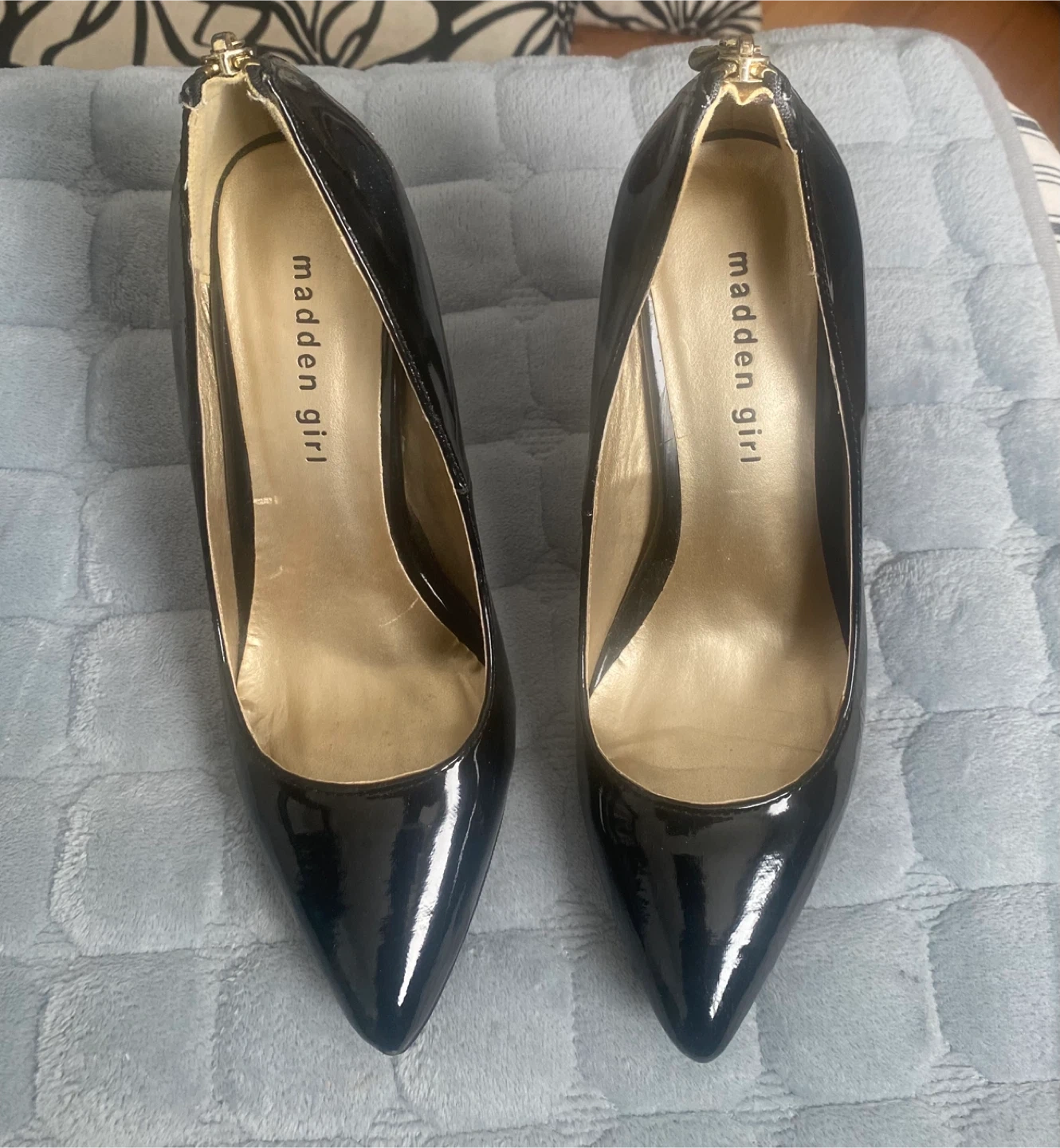 Selling a pair of Madden Girl black patent leather pointed heels. They are a size 8 and have a gold zipper detail at the back. These heels are perfect for a night out or a special occasion!