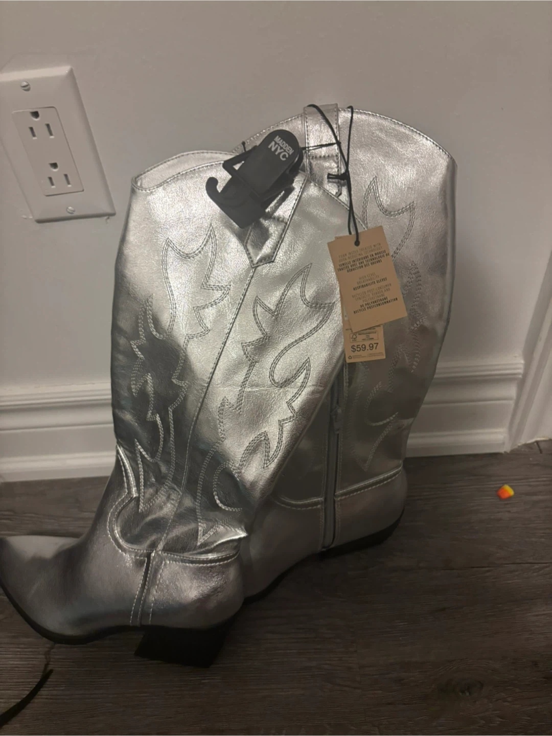 28These are a pair of Madden NYC Arizona cowboy boots in a shiny silver colour! They're a size 8 they were originally $59.97. never worn