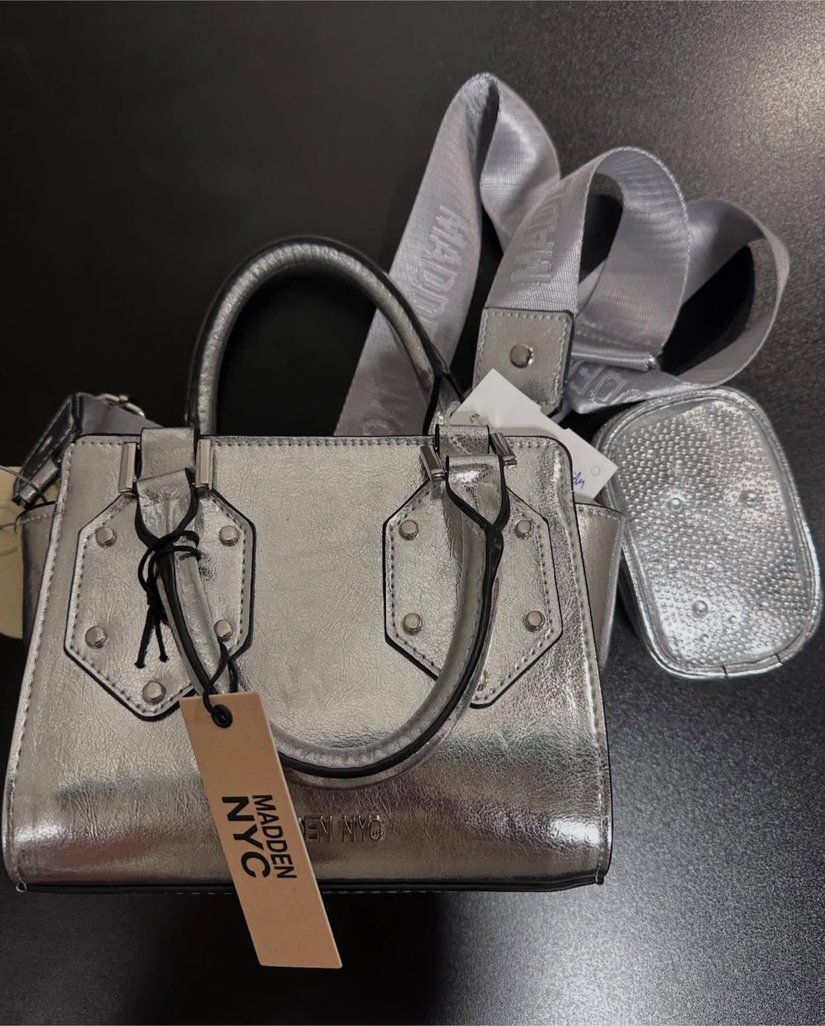 Check out this super cute silver mini top handle bag from Madden NYC! It comes with a detachable shoulder strap and a small pouch. Perfect for adding a bit of sparkle to your outfit!