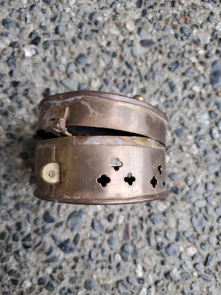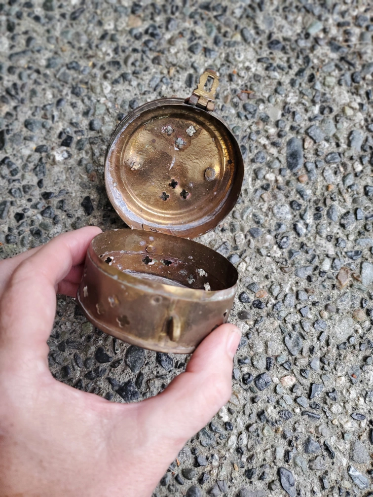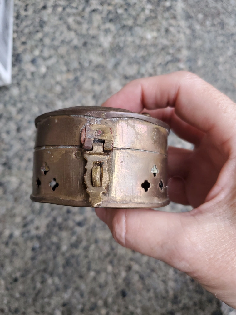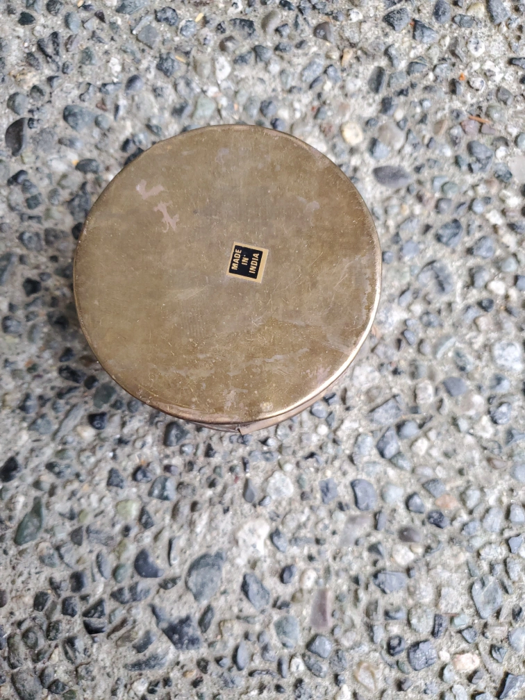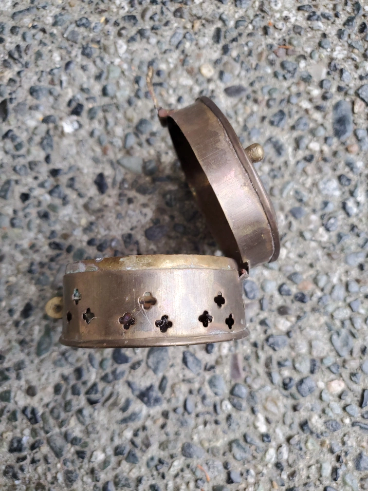 Here's a small brass incense burner, marked 'Made in India' on the bottom. It has a hinged lid and decorative cutouts around the side. It's in used condition, with some wear and patina from use. Cedar pick up. vintage.