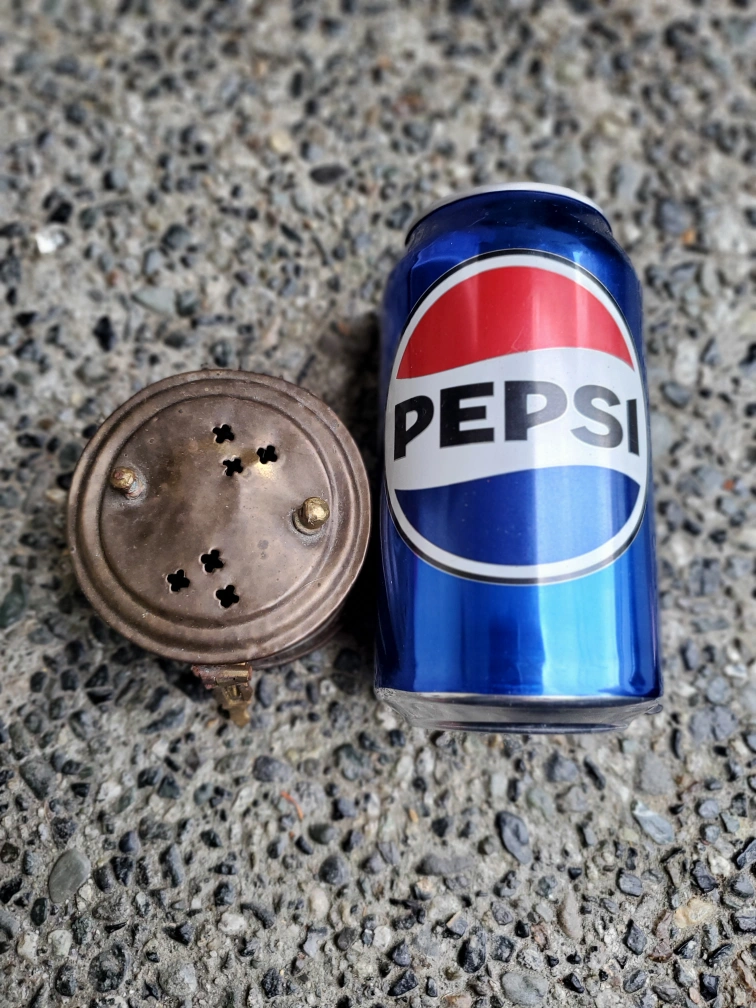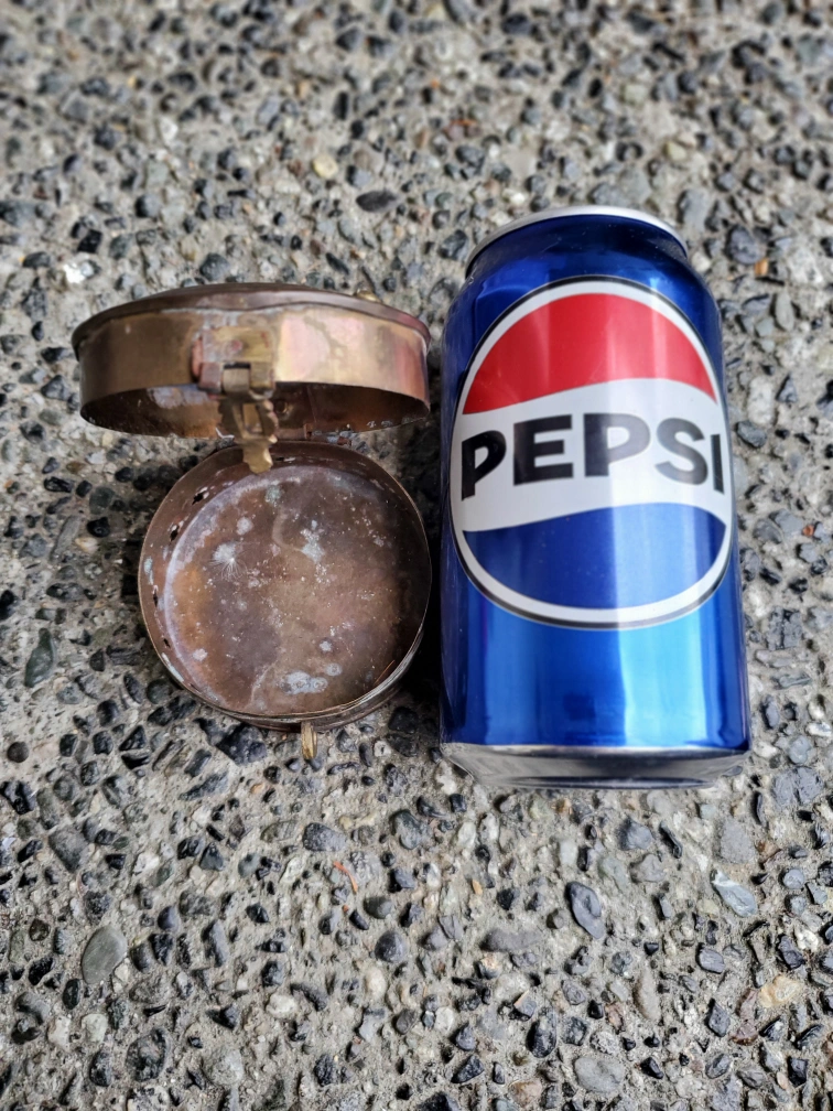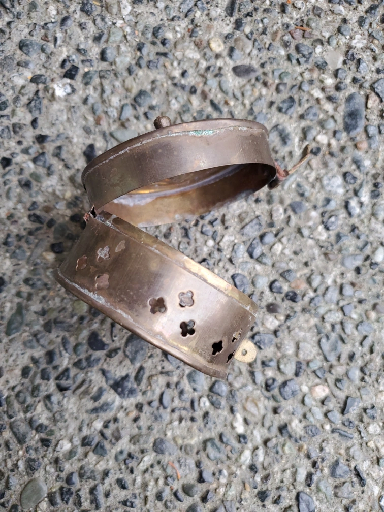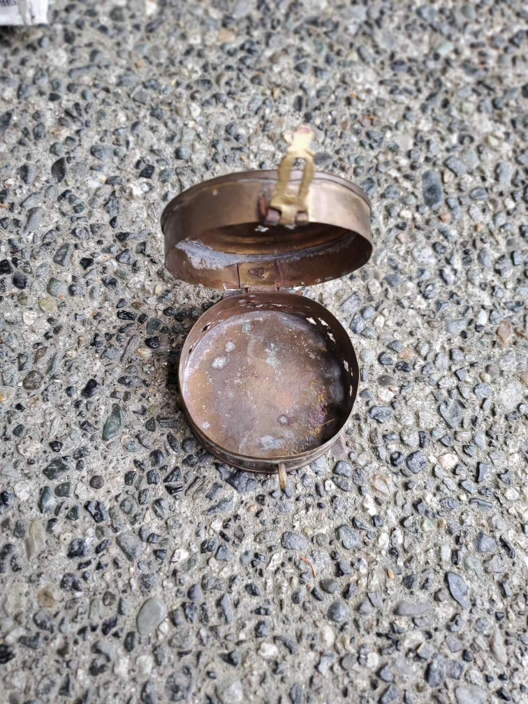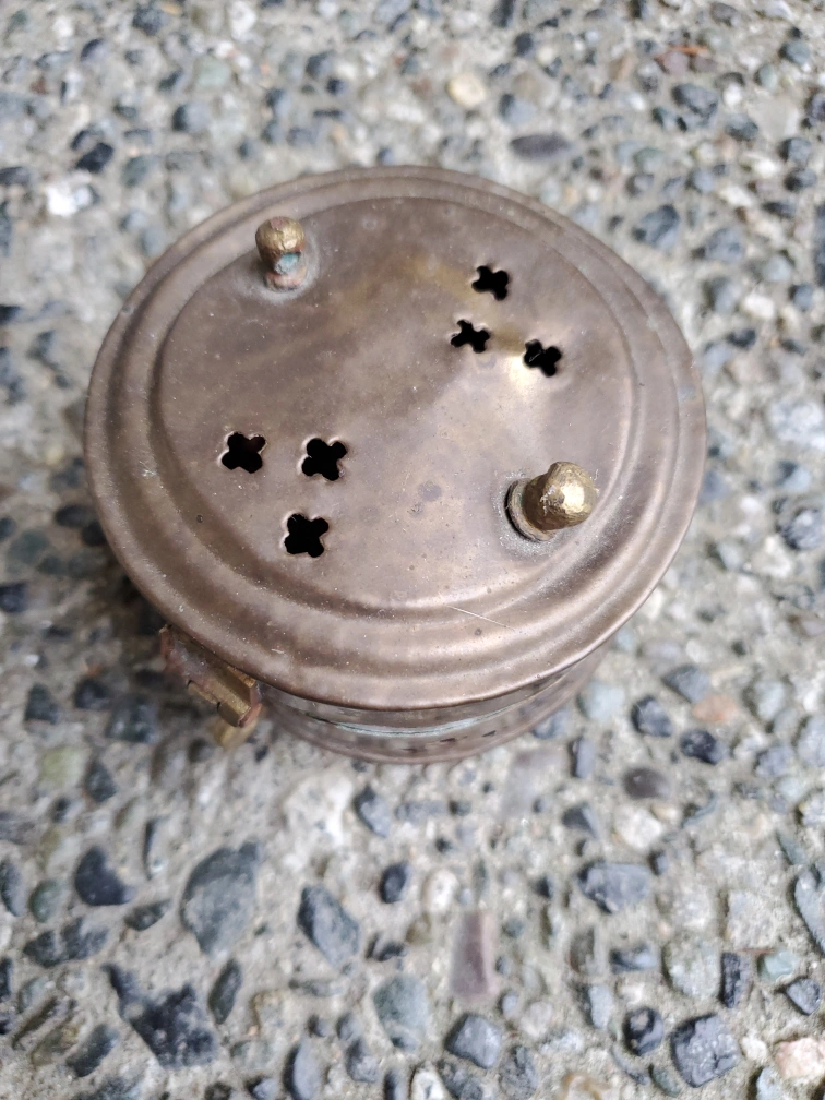 Here's a small brass incense burner, marked 'Made in India' on the bottom. It has a hinged lid and decorative cutouts around the side. It's in used condition, with some wear and patina from use. Cedar pick up. vintage.