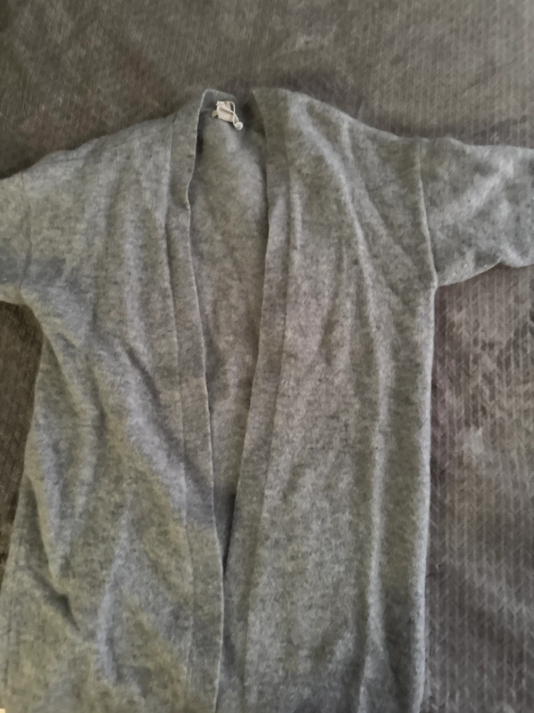 A simple grey cardigan. It's made of a soft, fuzzy material. This cardigan is great for layering over outfits.