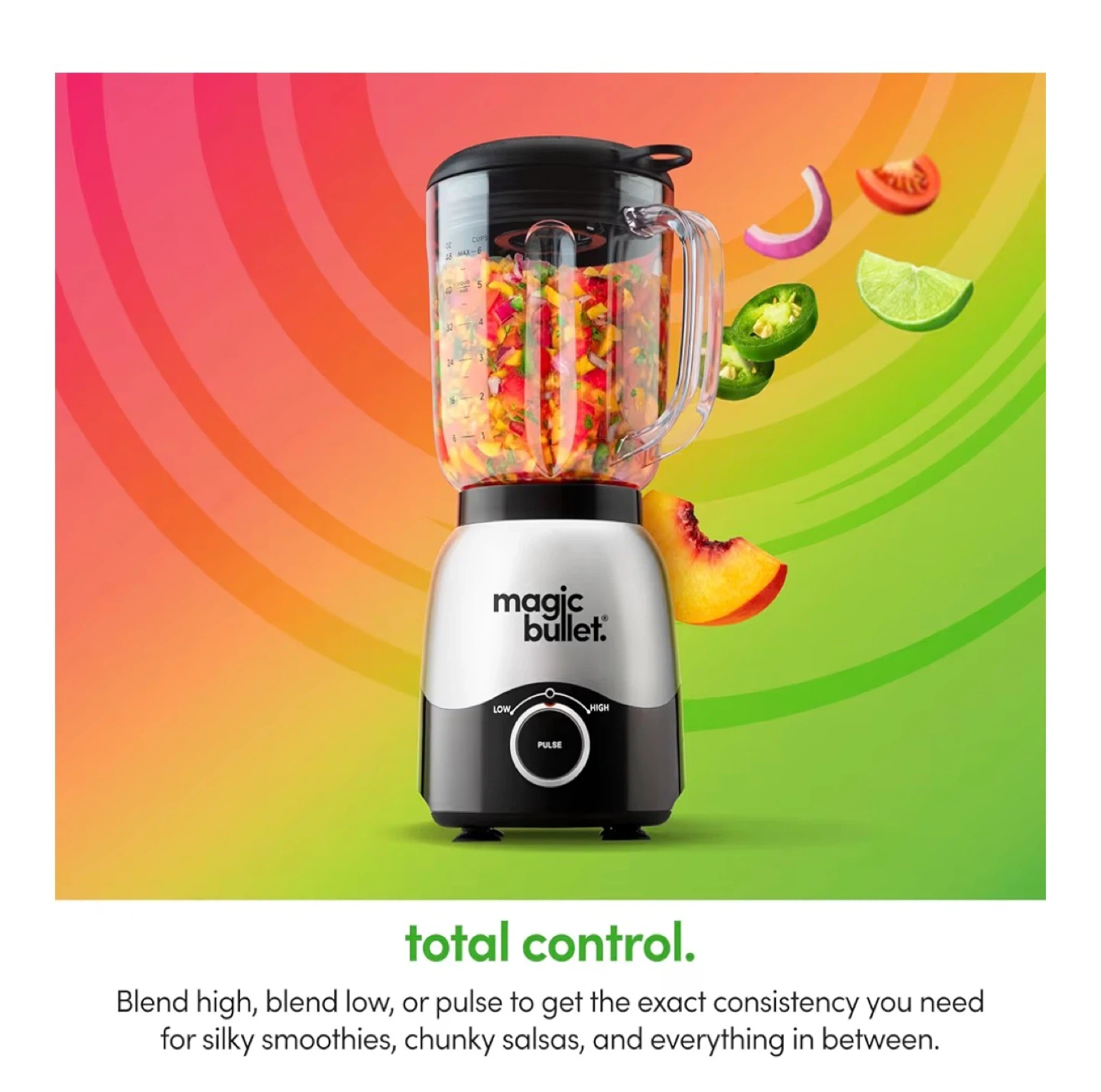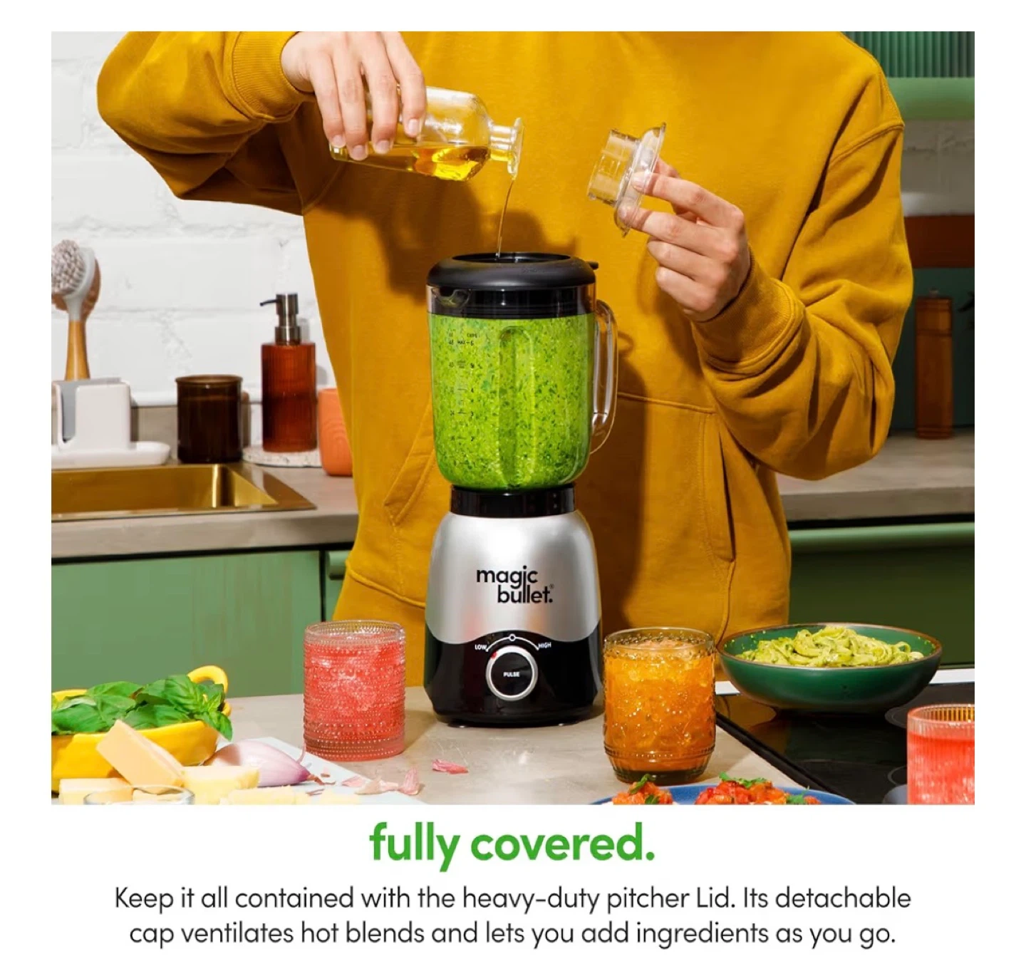 Blend high, blend low, or pulse to get the exact consistency you need for silky smoothies, chunky salsas, and everything in between. It's fully covered with the heavy-duty pitcher lid. Its detachable cap ventilates hot blends and lets you add ingredients as you go.