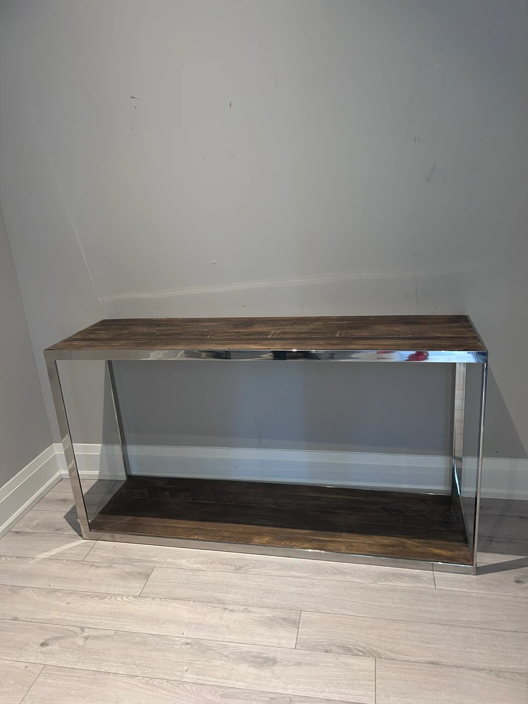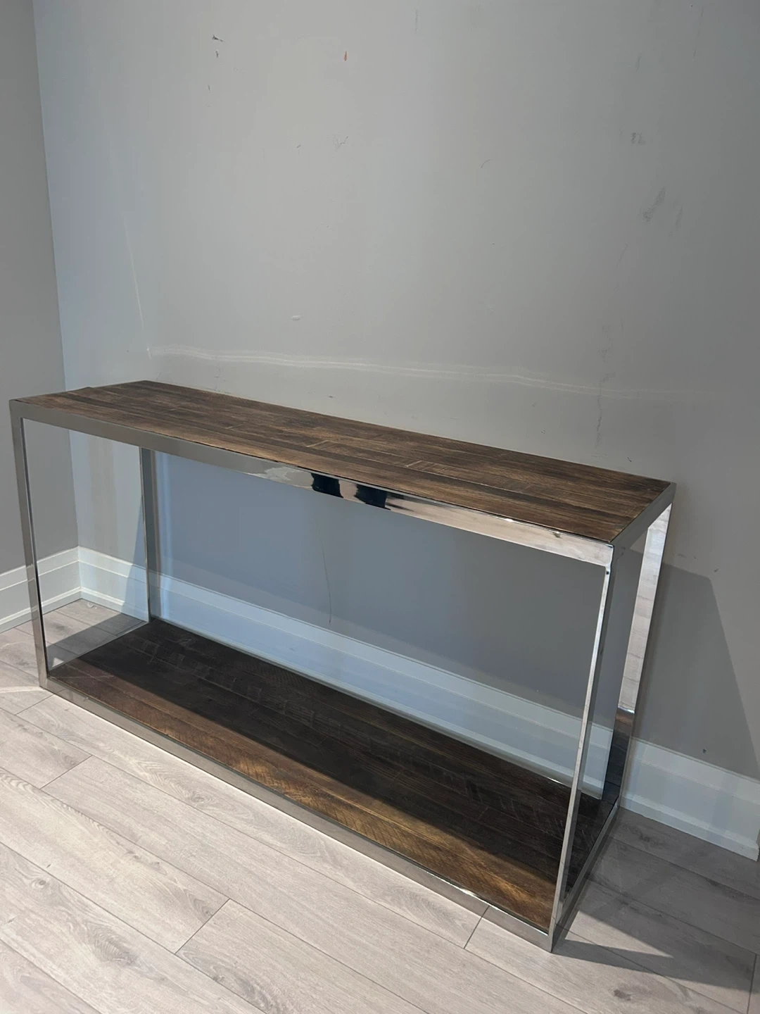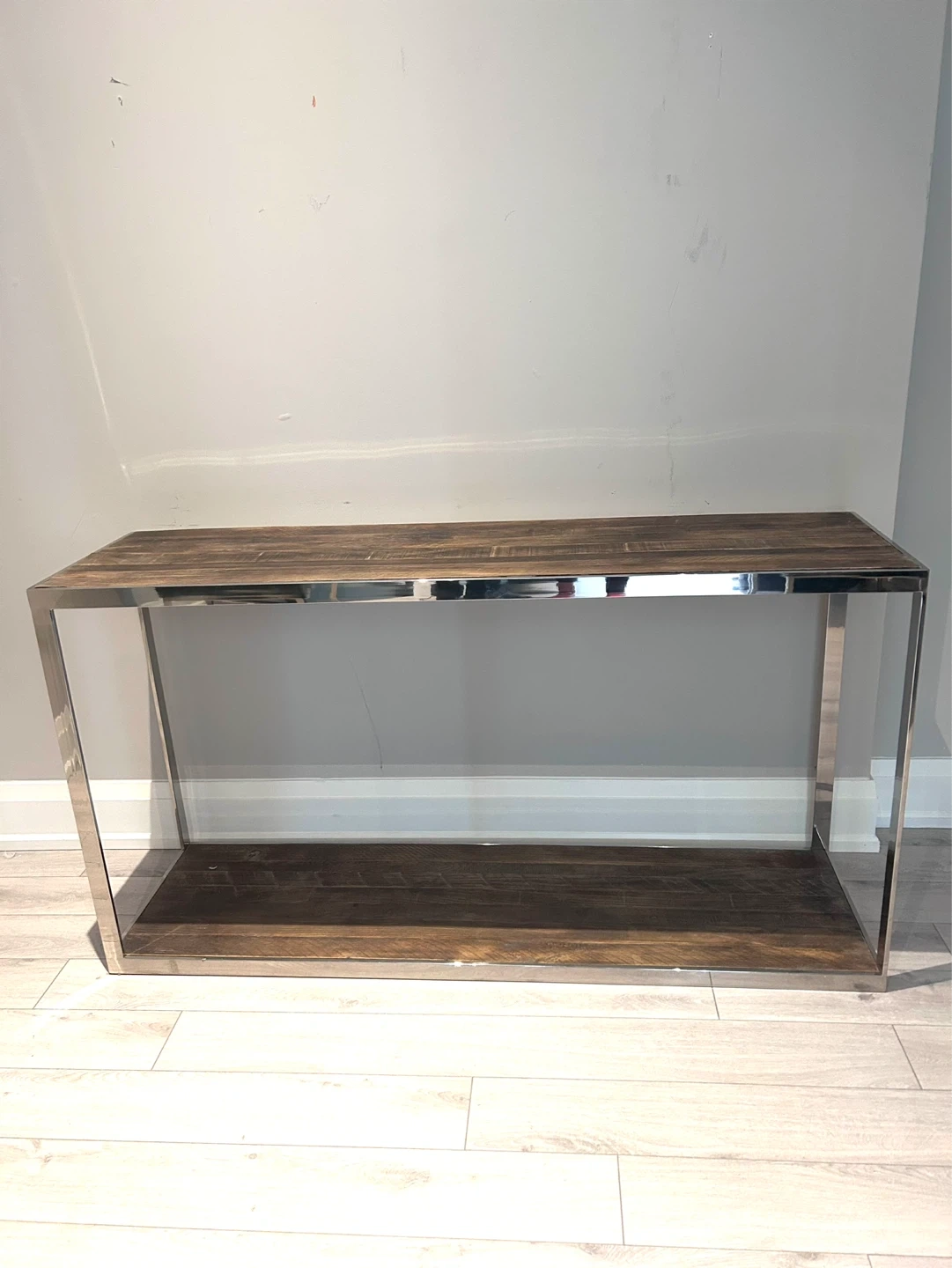 A stylish console table featuring a brushed metal frame and a dark wood top and shelf. It's a modern piece perfect for an entryway or living room. The dimensions are: 34inches high, 63 inches wide, and 18 inches deep.
