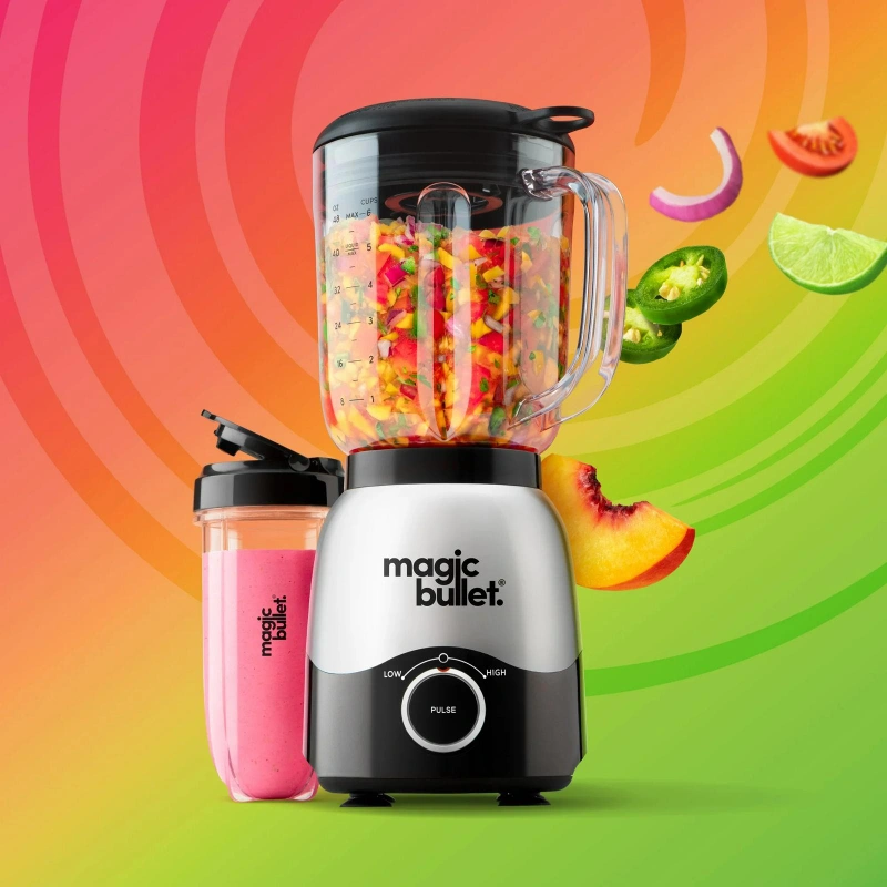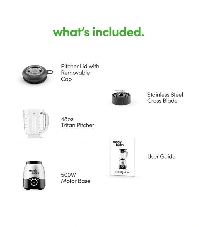 15A 600-Watt power base makes this product most powerful magic bullet ever. A heavy-duty pitcher lid with removable cap keeps it all under control. Makes smoothies, shakes, and other tasty treats. Twist on the to-go lid to enjoy on the run. Blend high, blend low, or pulse to get the exact consistency you need for silky smoothies, chunky salsas, and everything in between. Included: Motor Base, Stainless Steel Cross Blade, 48 oz Pitcher, Pitcher lid with removable cap, Tall Cup, To-Go Lid. Hassle-free cleaning - simply twist off the blade, rinse with soap and water, and put the cups in the top rack of the dishwasher. DM for pickup in Brampron or delivery at a fee.