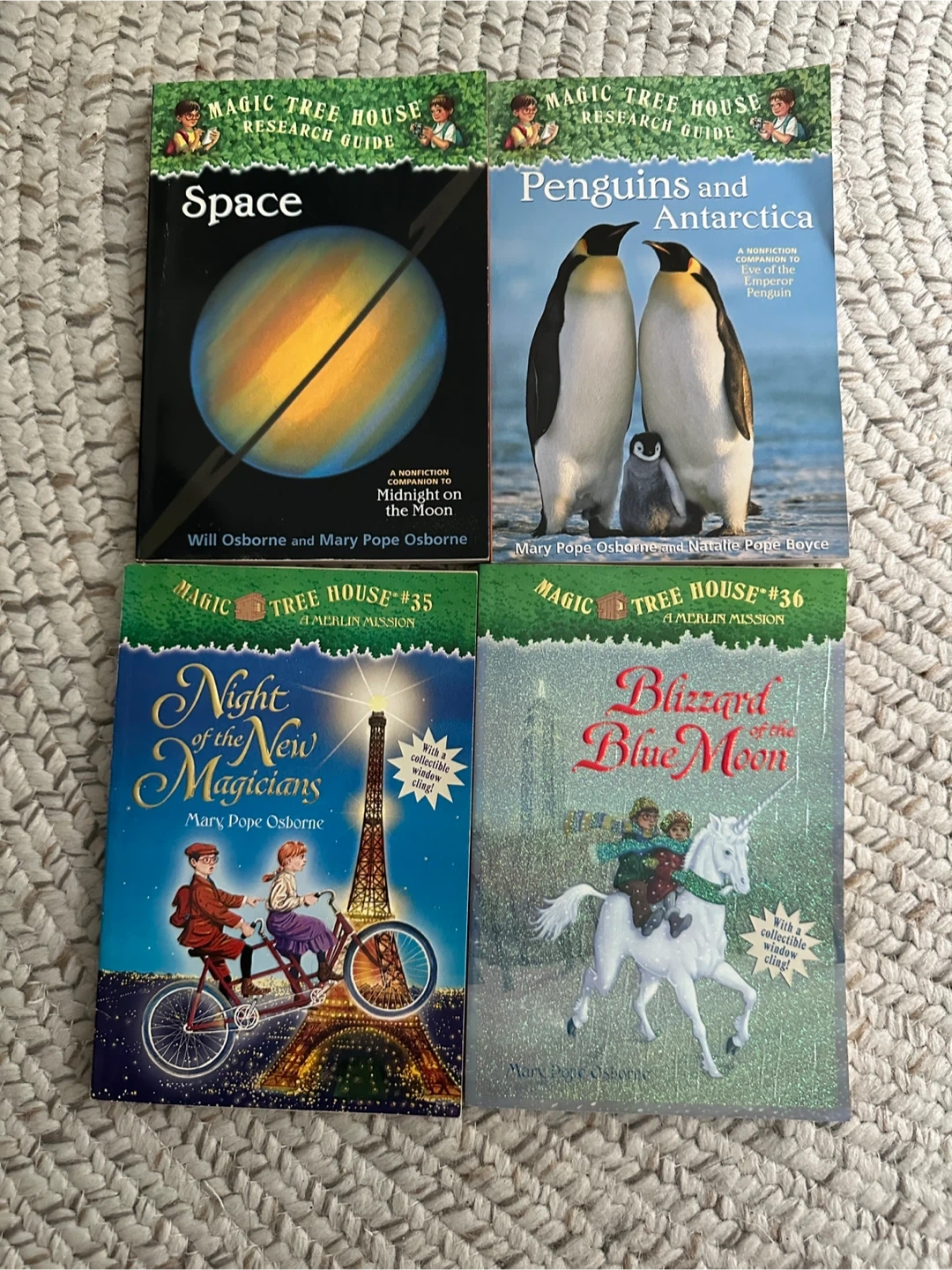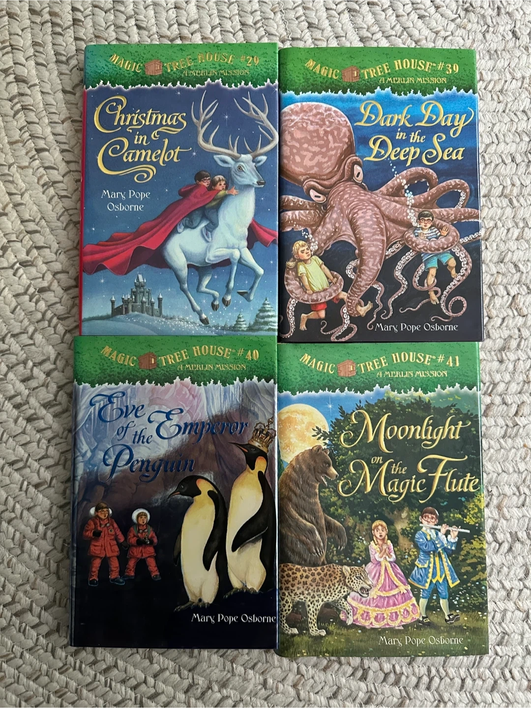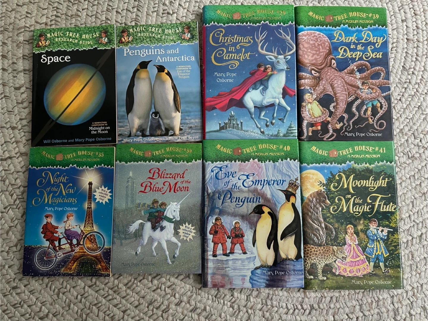 Selling a collection of Magic Tree House books by Mary Pope Osborne. This bundle includes hardcover: - Christmas in Camelot (#29) - Dark Day in the Deep Sea (#39) - Eve of the Emperor Penguin (#40) - Moonlight on the Magic Flute (#41) Paperback: - Night of the New Magicians (#35) - Blizzard of the Blue Moon (#36) - Space (Research Guide) - Penguins and Antarctica (Research Guide) Perfect for young readers!