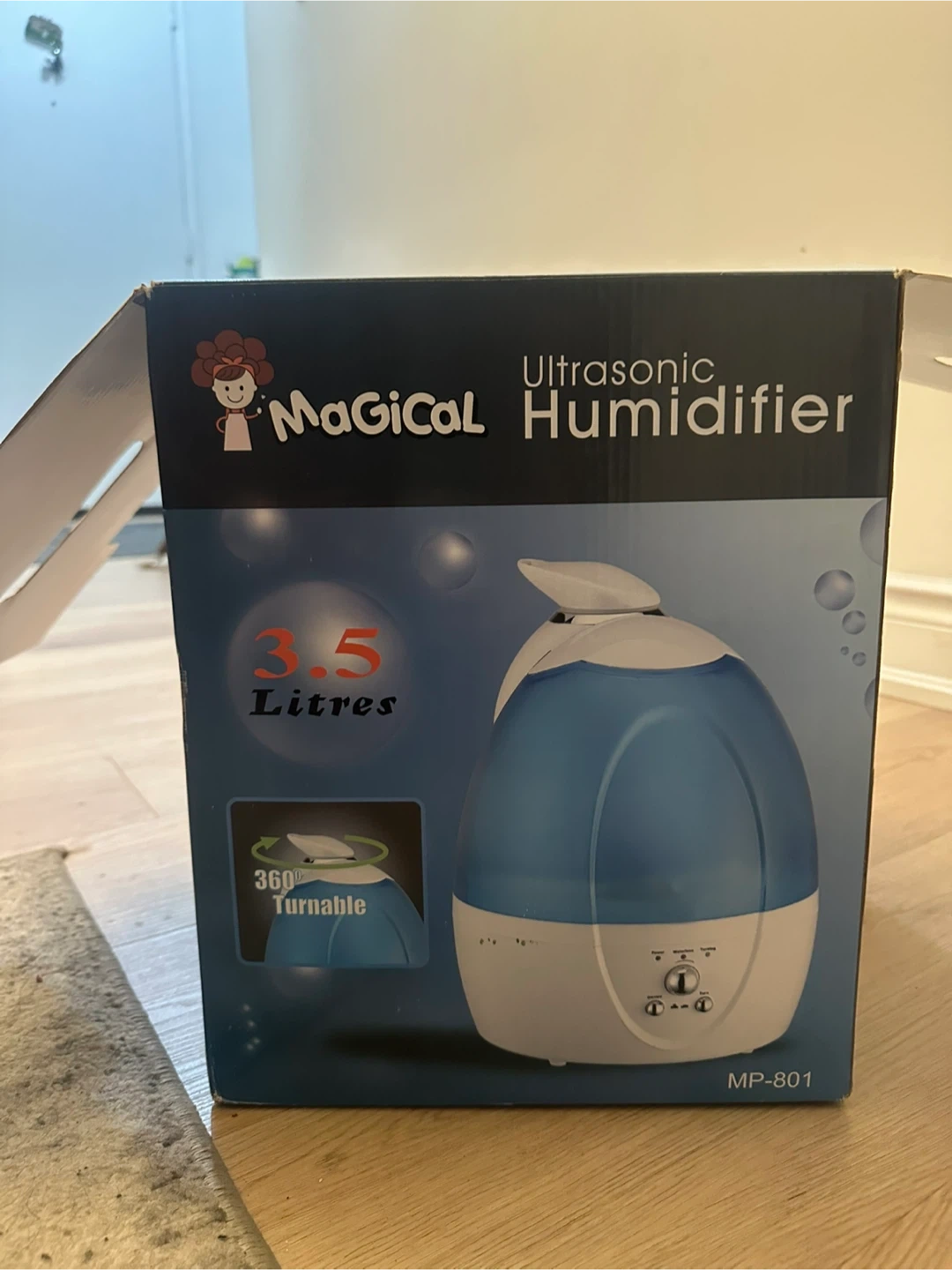 12Selling a Magical Ultrasonic Humidifier, perfect for adding moisture to your home! It has a 3.5-litre water tank capacity and offers variable mist control. This humidifier features a 360° turnable mist outlet and an operation and low water level indicator. It also has advanced noise control design for quiet operation. Comes with the original box! Everything is working. Good can also deliver it, depending on the location.
