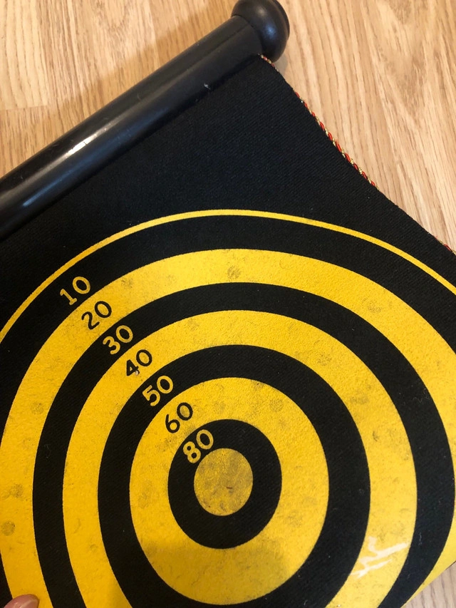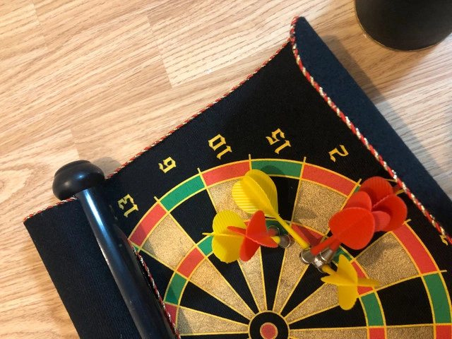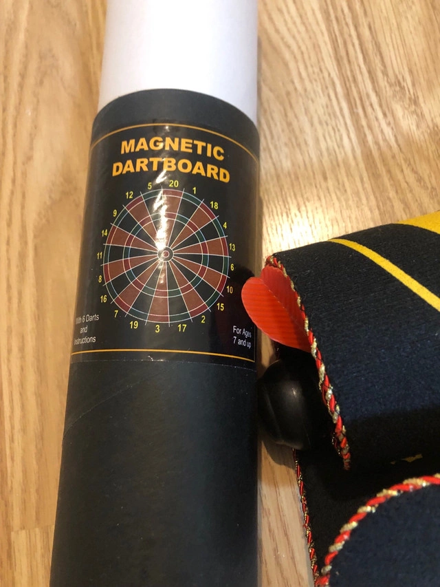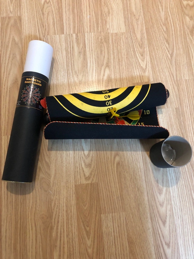 Have some fun with this magnetic dartboard, perfect for all ages and skill levels! This dartboard is in used condition but still has lots of life left for friendly competition. * Magnetic dartboard with safe magnetic darts * Roll-up design for easy storage and portability * Suitable for ages 6 and up Looking to add a touch of whimsy to your game nights? This magnetic dartboard is just the ticket! It's like a party in a tube, ready to roll out fun whenever you are. If the ad is up, it's available!