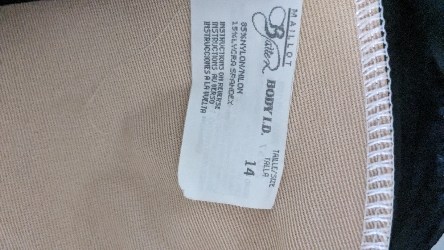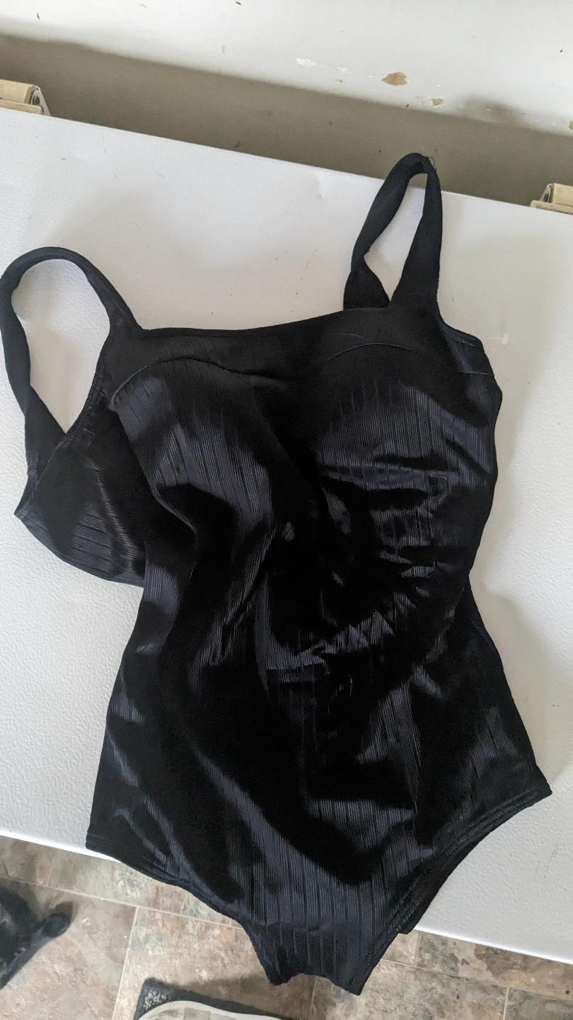 new Black one-piece swimsuit. Size 14. 85% nylon, 15% lycra spandex. Features ribbed texture and adjustable straps. n
