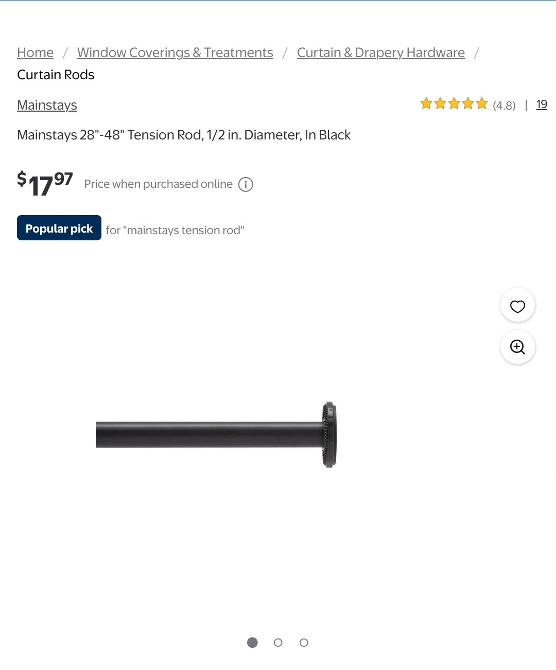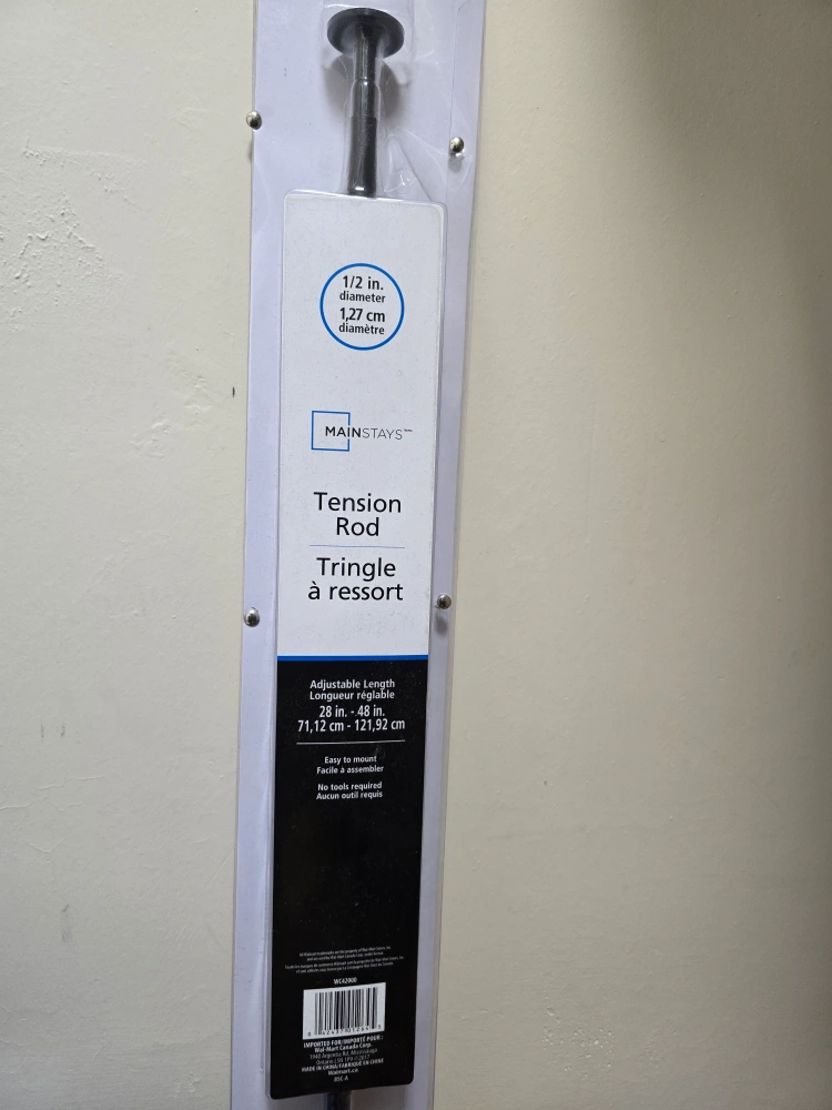 Selling a Mainstays tension rod, perfect for curtains or other lightweight hangings! It's black and adjustable from 28 to 48 inches. Easy to mount and in great condition. Unused in original packaging The Mainstays Spring Tension Curtain rod is a versatile and easy to use solution for hanging your curtains. The 1/2” diameter matte black metal rod adjusts in length to fit your window and has matching braided decorative ends with non-slip, non-scratch rubber to hold the rod securely in place. It is easy to install, mounting inside your windows casing, with no tools required. Ideal for any space where a simple solution is needed.