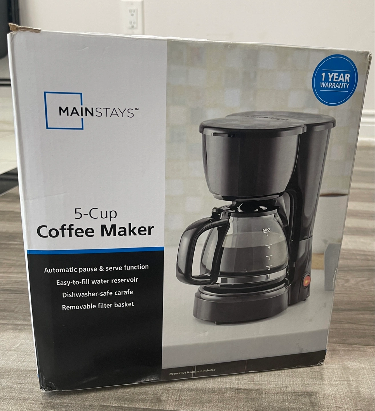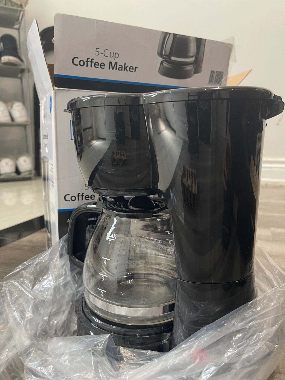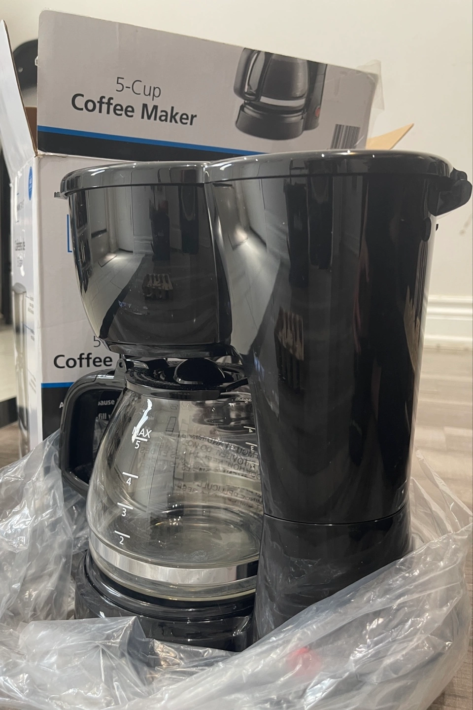 83Black coffee maker. Comes with the box and packaging. Includes a glass carafe. A fresh cup of coffee is always a great way to start your day.