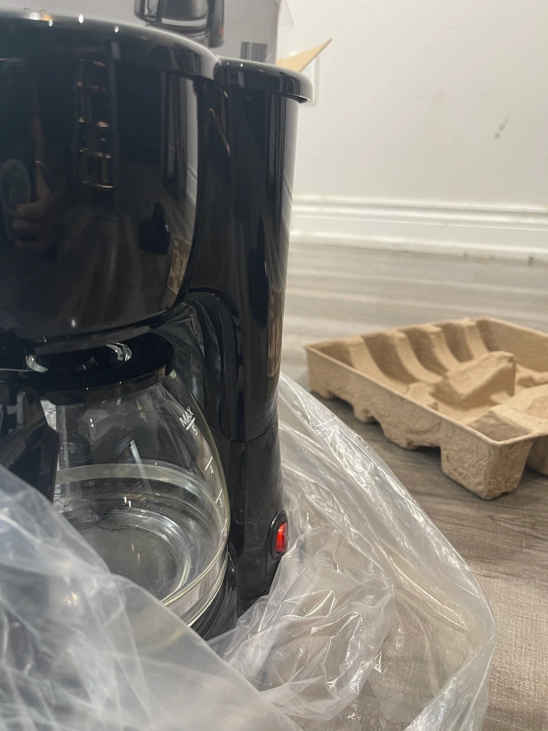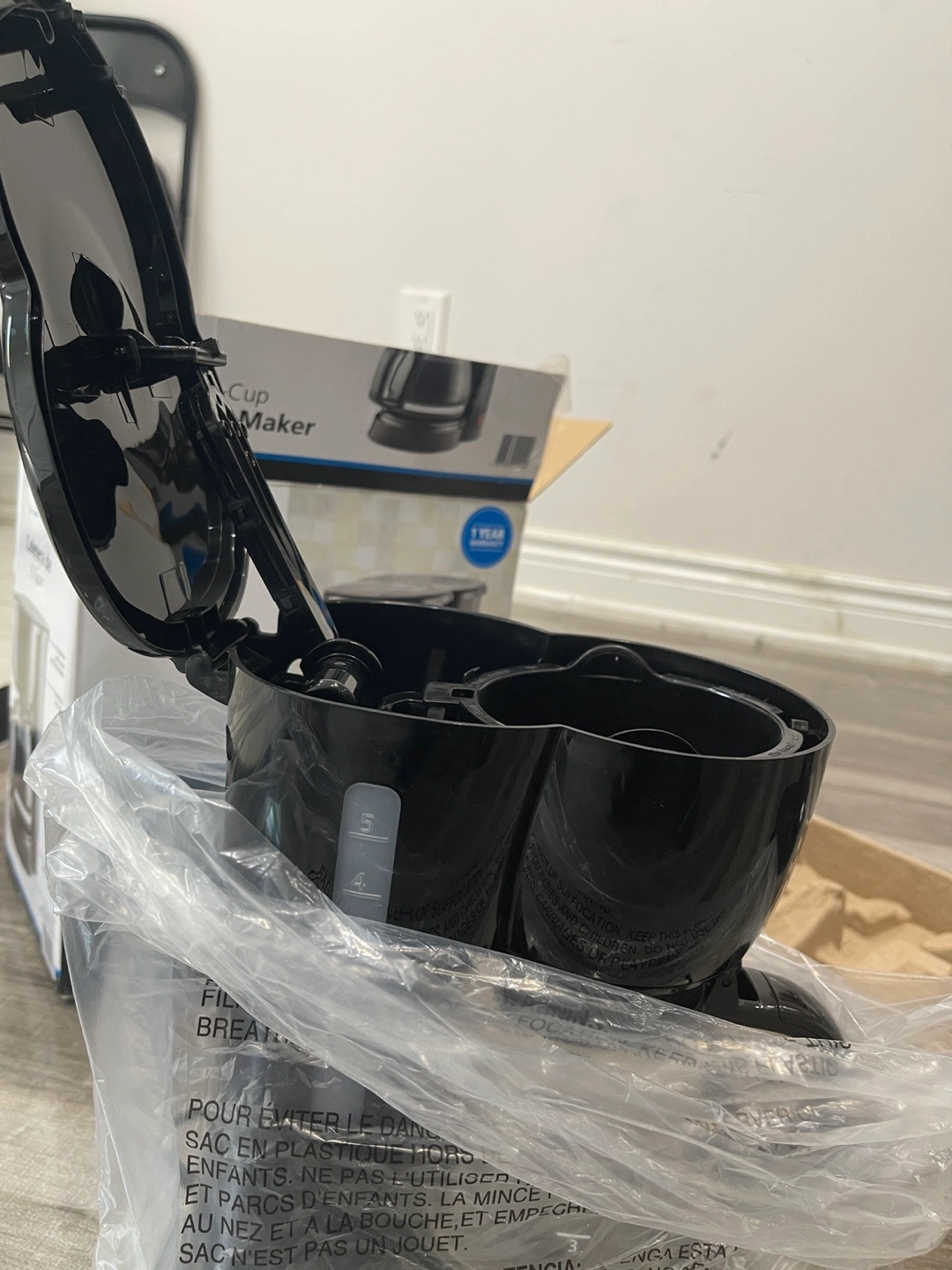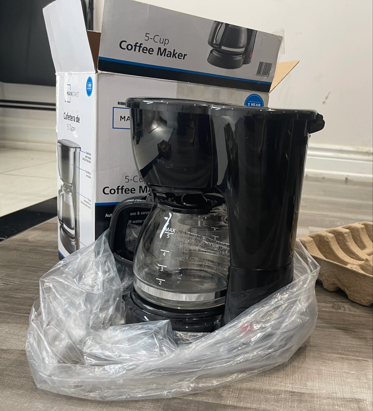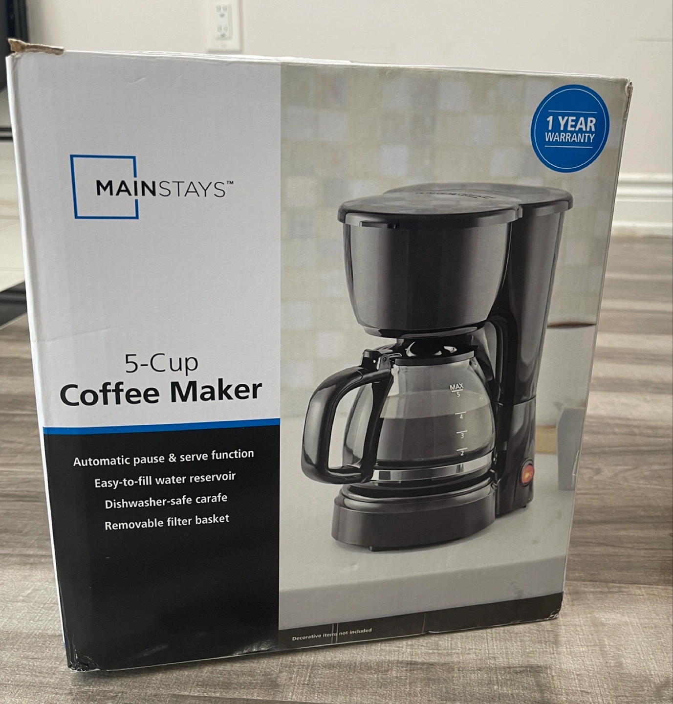83Black coffee maker. Comes with the box and packaging. Includes a glass carafe. A fresh cup of coffee is always a great way to start your day.