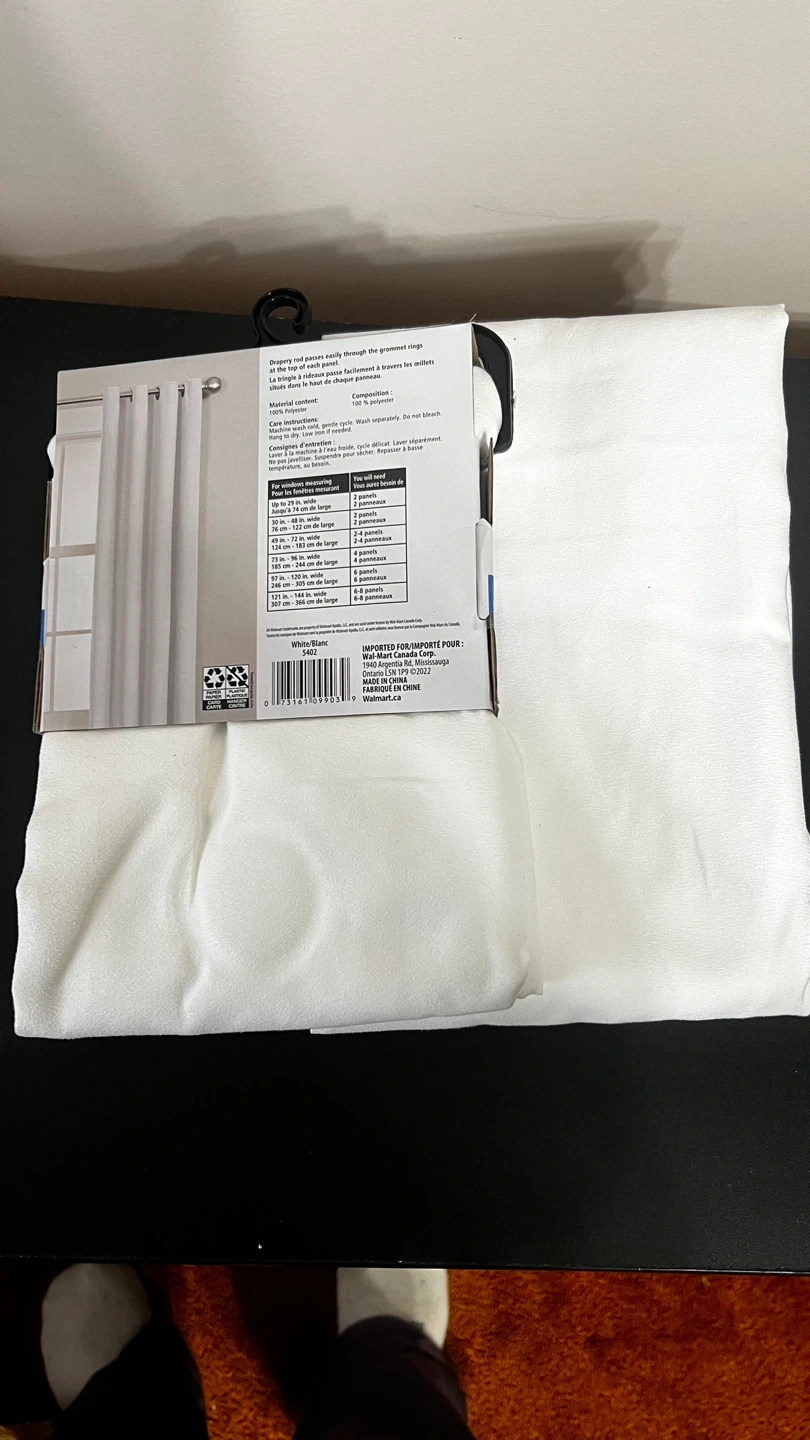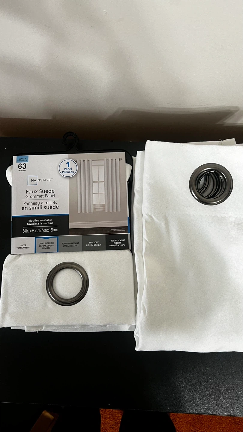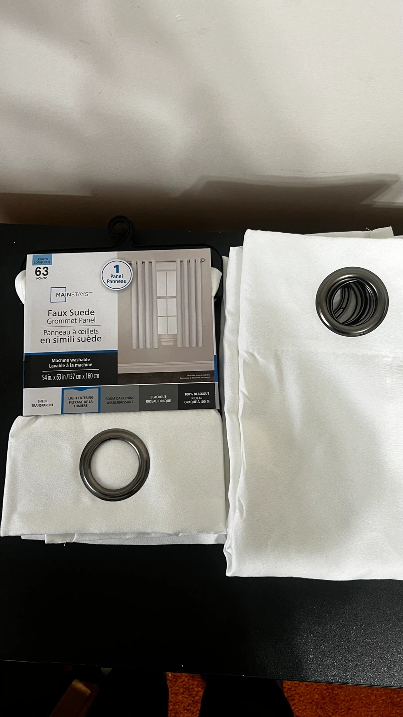 10Selling a Mainstays Faux Suede Grommet Panel curtain in white! It's 54 x 63 inches in length and machine washable. Colour white The material is light filtering and provides 100% blackout.