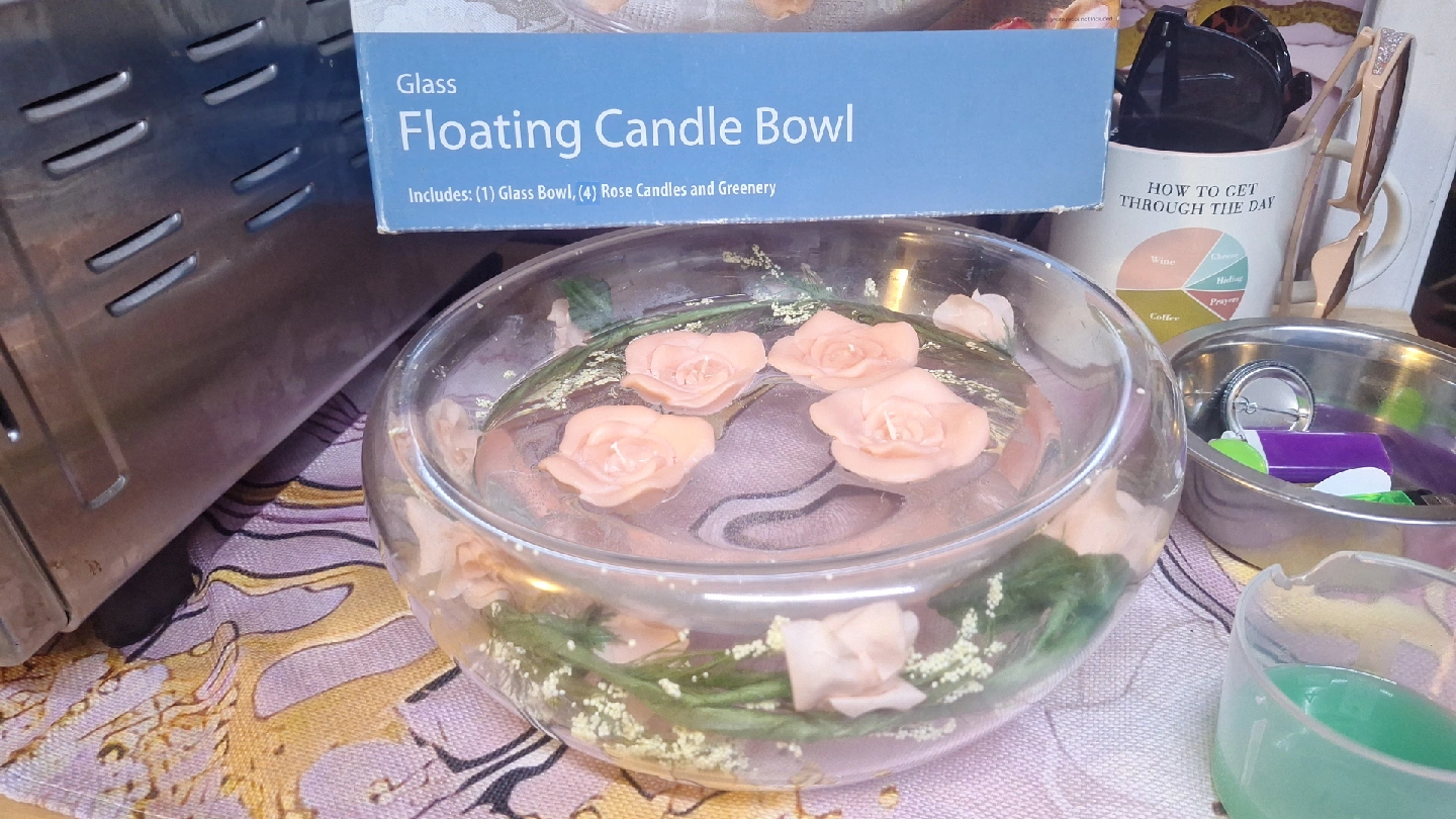 Add a touch of elegance to your space with this Mainstays glass floating candle bowl! It includes a glass bowl, rose candles, and greenery. Perfect for creating a relaxing ambiance in any room