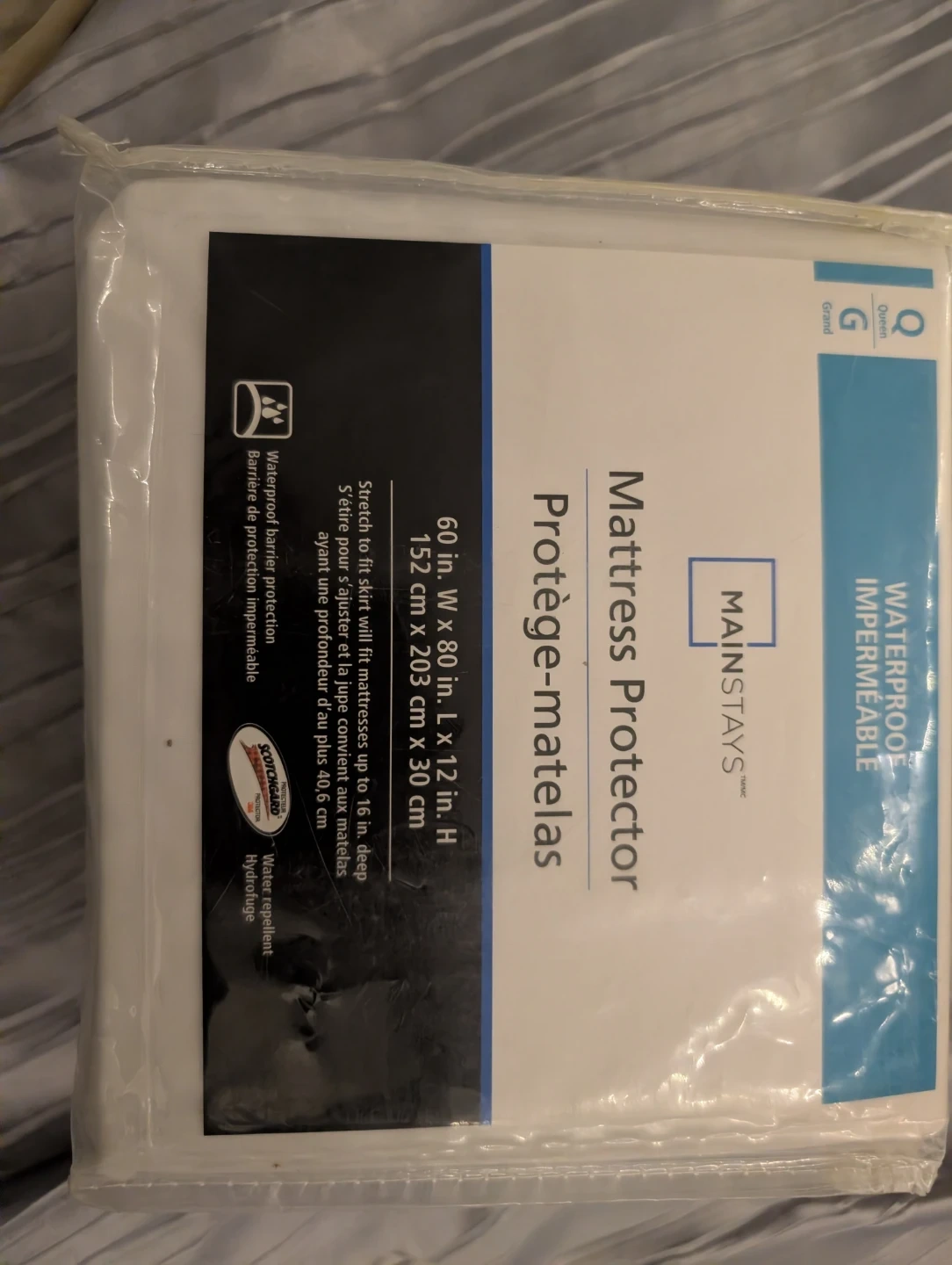 101Selling a brand new Mainstays mattress protector, still in its original packaging! It's designed to fit mattresses up to 16 inches deep. Waterproof provides stain and spill protection Stretches to Fit mattresses up to 16 inches deep Machine Washable for easy care - Size: 60 in W x 80 in L x 12 in H (152 cm x 203 cm x 30 cm) FITS A QUEEN MATTRESS