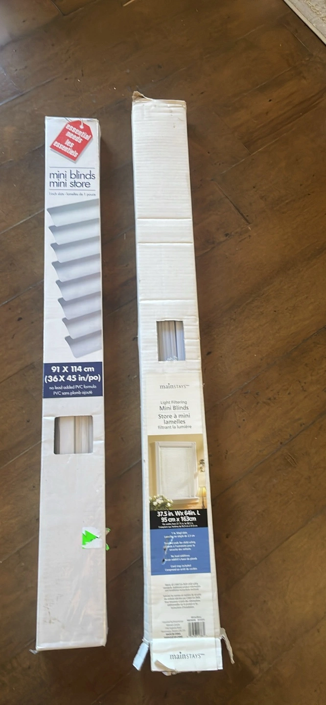 20I have two sets of mini blinds for sale! One is from Essential Needs and measures 91 x 114 cm (36 x 45 in), and the other is a Mainstays light filtering mini blind measuring 37.5 in wide by 64 in long (95 cm x 163 cm). Both are new in box!