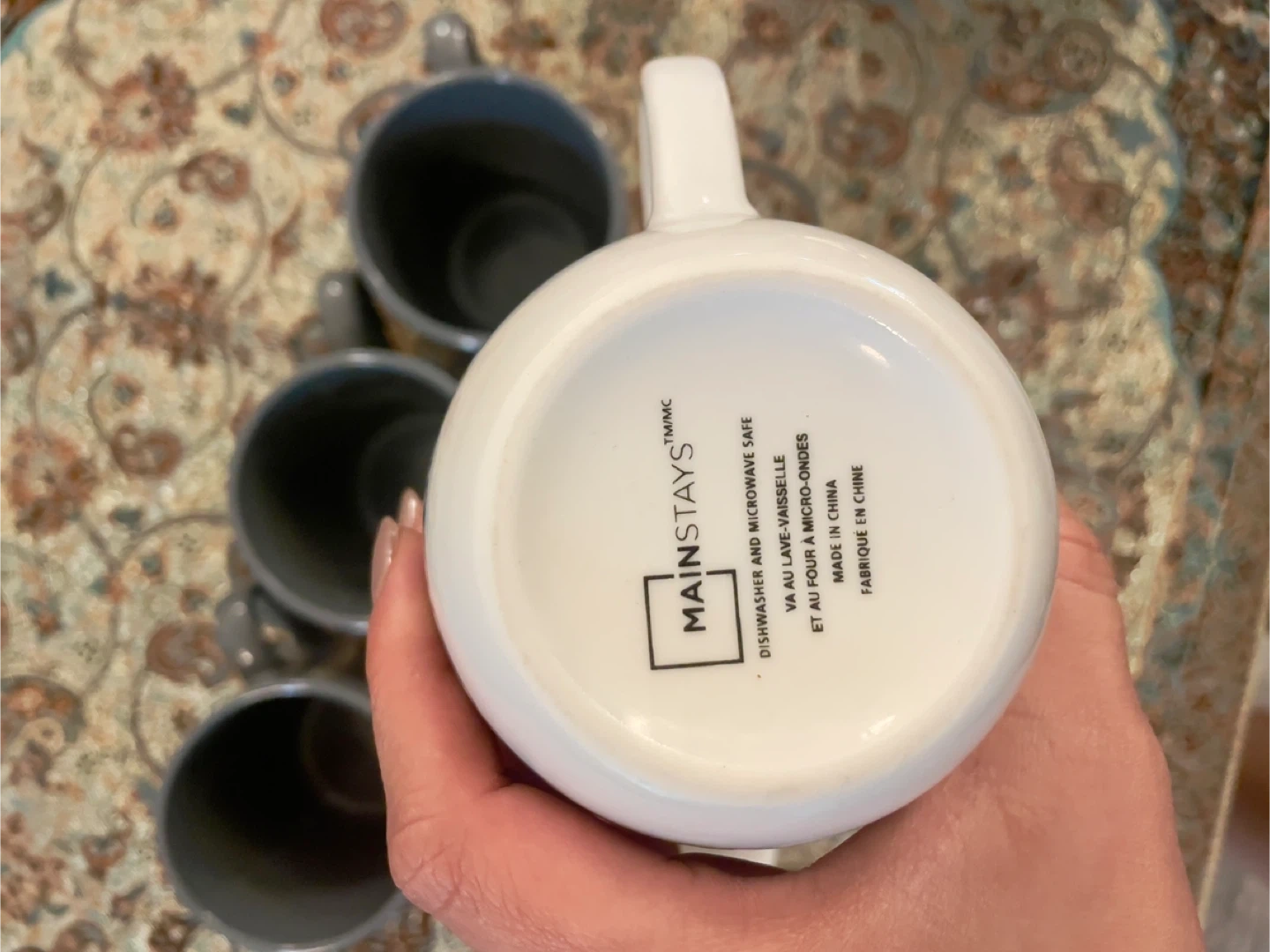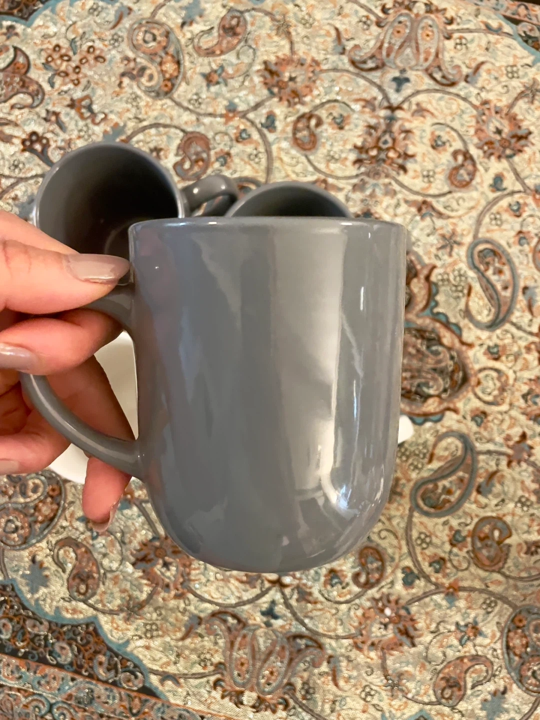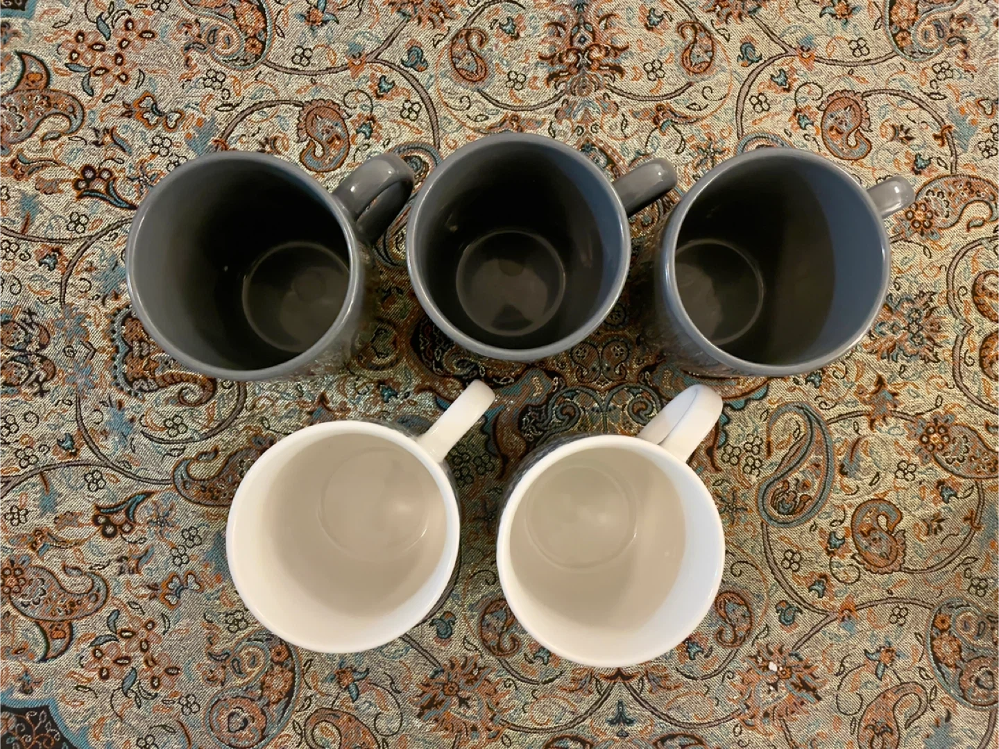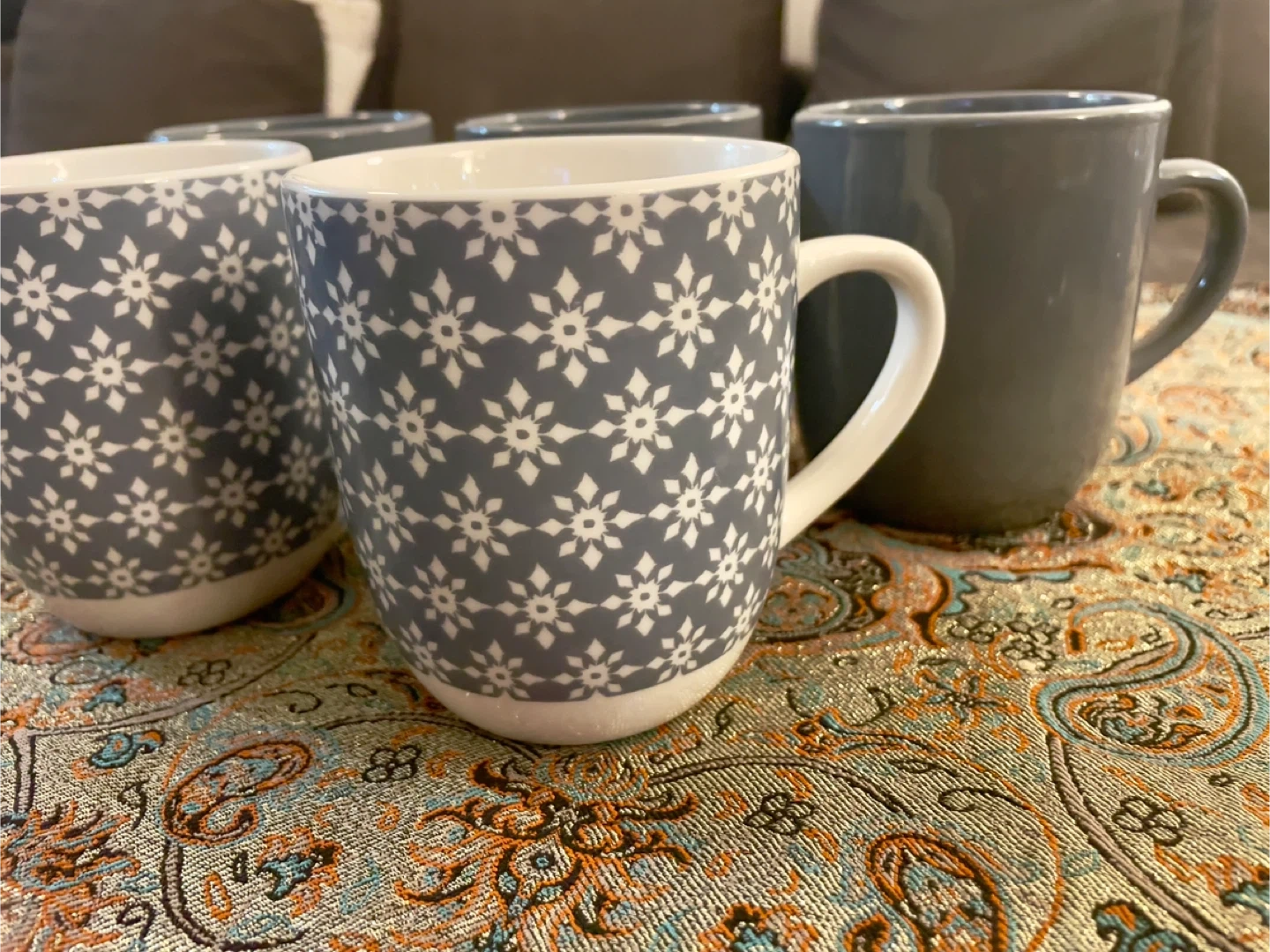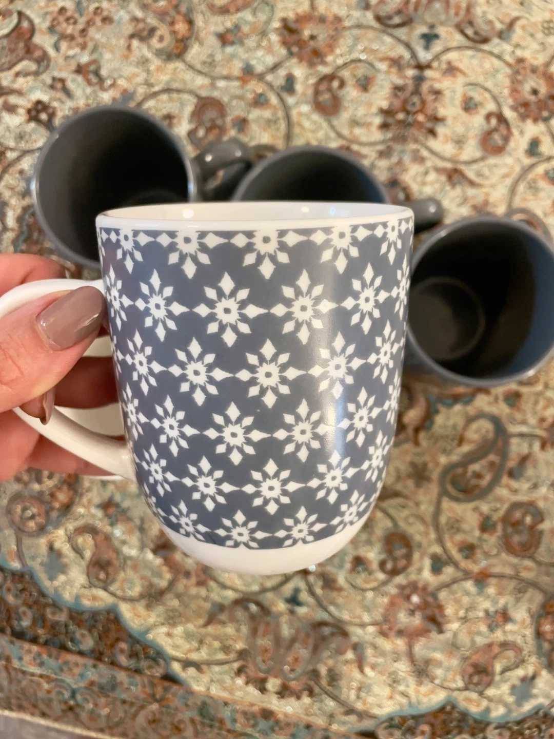 Selling a set of 5 Mainstays mugs! There are 3 grey mugs and 2 white mugs with a grey snowflake pattern. They are dishwasher and microwave safe.