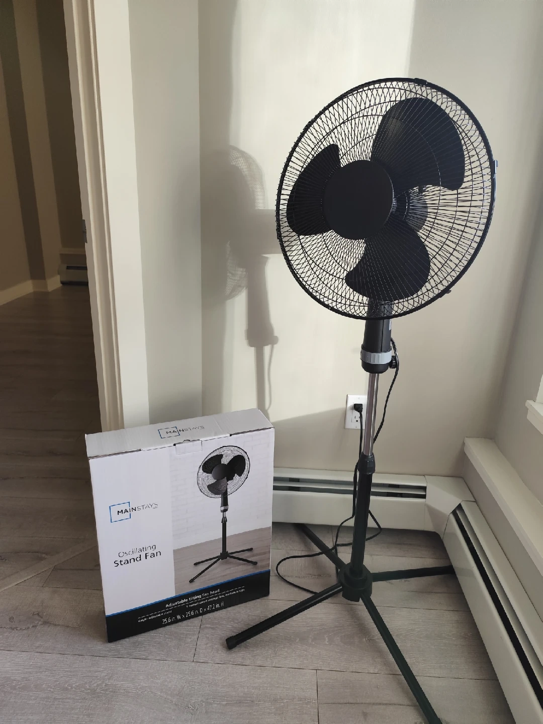 12Selling a Mainstays oscillating stand fan in black. It's in good condition and comes with the original box. The fan features an adjustable tilting head and measures 25.6 inches in width and depth, and 47.2 inches in height