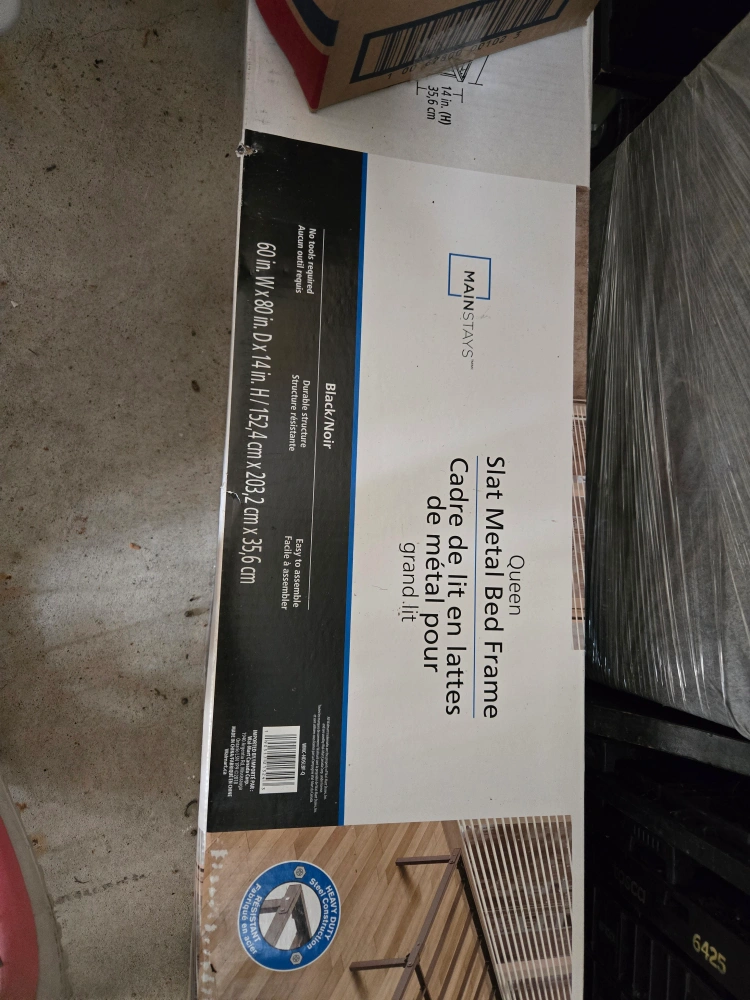 75Selling a Mainstays Queen Slat Metal Bed Frame in black. It's easy to assemble and has a durable structure. The dimensions are 60 in W x 80 in D x 14 in H / 152.4 cm x 203.2 cm x 35.6 cm