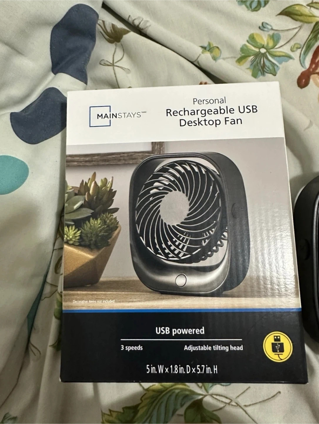 10Portable Mainstay fan with rechargeable battery. Works perfectly, quiet operation, and holds charge well. Ideal for desk, travel, or small rooms.