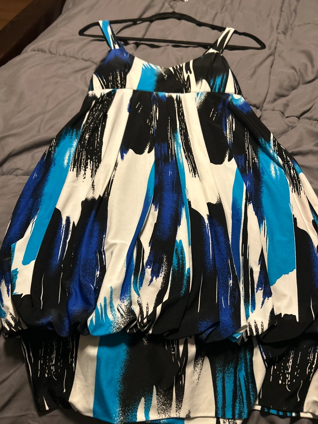 111Selling a Majora Top in size M/M. It features a unique blue, white, and black pattern. The care instructions recommend washing separately in cold water, avoiding bleach, and hanging to dry. Iron on low setting if needed
