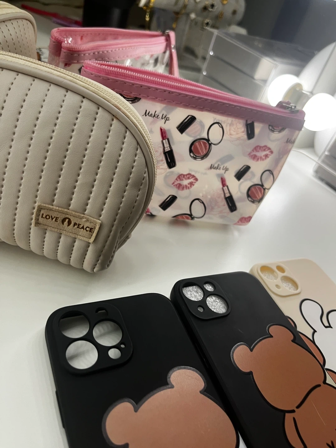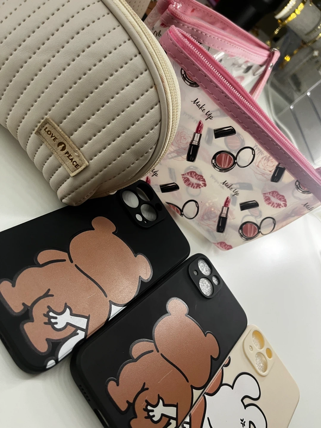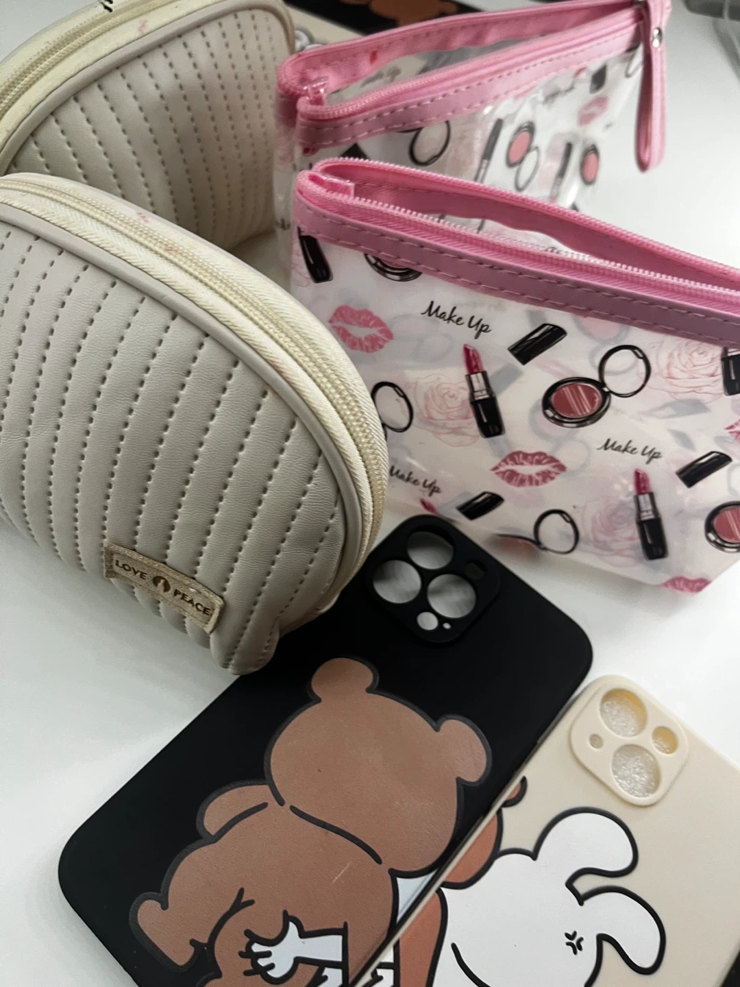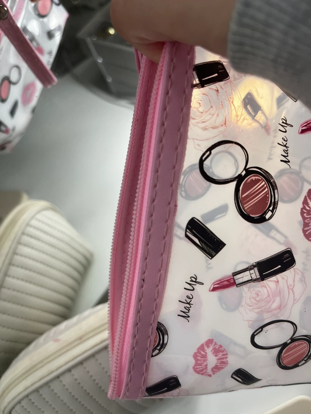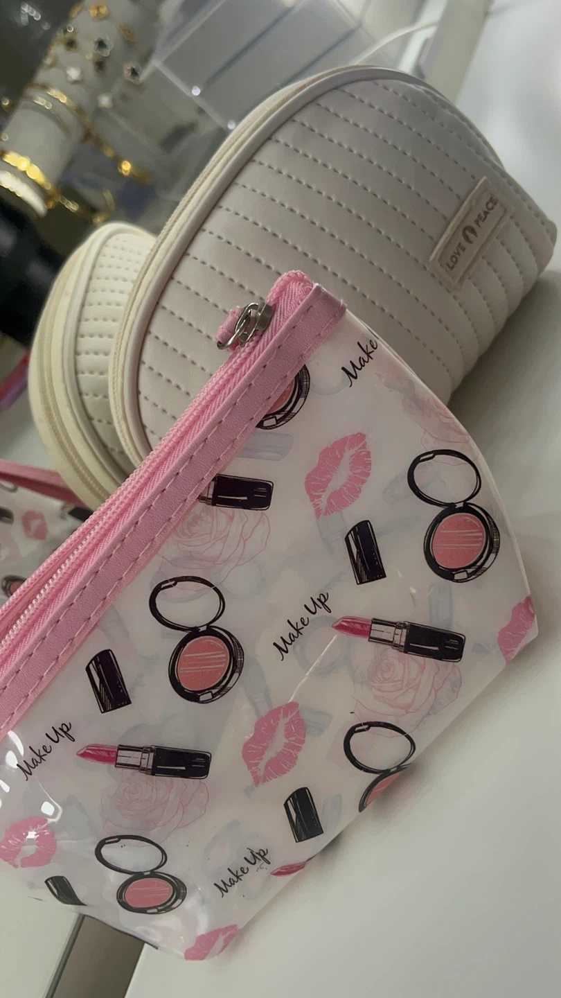 Cute makeup bag with a clear body and pink trim! It has a fun makeup-themed print all over it. Perfect for keeping your essentials organized